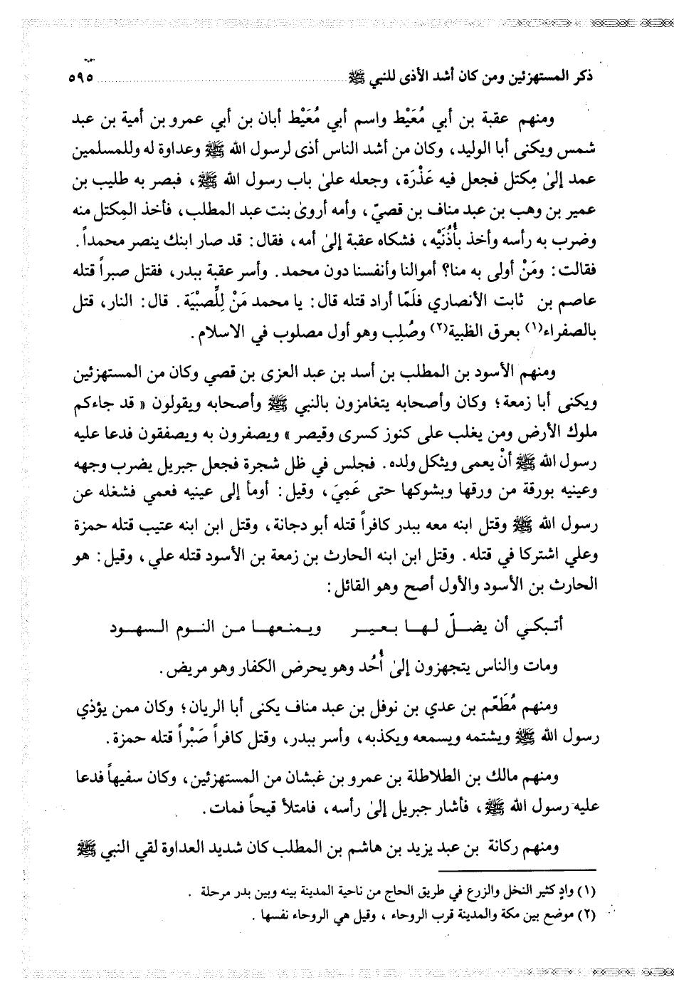 ومنهم الأسود بن المطلب بن أسد بن عبد العزى بن قصي وكان من المستهزئين ويكنى أبا زمعة وكان وأصحابه يتغامزون بالنبي وأصحابه ويقولون قد جاءكم ملوك الأرض ومن يغلب على كنوز كسرى وقيصر ويصفرون به ويصفقون فدعا عليه رسول الله أن يعمى ويثكل ولده فجلس في ظل شجرة فجعل جبريل يضرب وجهه وعينيه بورقة من ورقها وبشوكها حتى عمي وقيل أومأ إلى عينيه فعمي فشغله عن رسول الله وقتل ابنه معه ببدر كافرا قتله أبو دجانة وقتل ابن ابنه عتيب قتله حمزة وعلي اشتركا في قتله وقتل ابن ابنه الحارث بن زمعة بن الأسود قتله علي وقيل هو الحارث بن الأسود والأول أصح وهو القائل