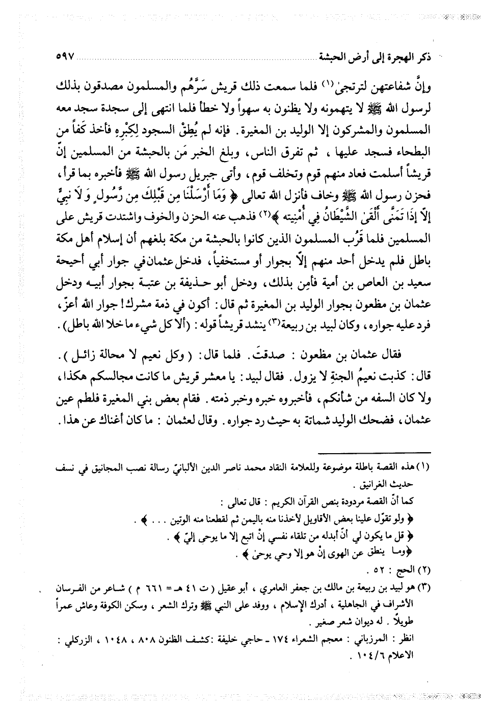 وإن شفاعتهن لترجى فلما سمع ذلك قريش سرهم والمسلمون مصدقون بذلك لرسول الله لا يتهمونه ولا يظنون به سهوا ولا خطأ فلما انتهى إلى سجدة سجد معه المسلمون والمشركون إلا الوليد بن المغيرة فإنه لم يطق السجود لكبره فأخذ كفا من البطحاء فسجد عليها ثم تفرق الناس وبلغ الخبر من بالحبشة من المسلمين إن قريشا أسلمت فعاد منهم قوم وتخلف قوم وأتى جبريل رسول الله فأخبره بما قرأ فحزن رسول الله وخاف فأنزل الله تعالى { وما أرسلنا من قبلك من رسول ولا نبي إلا إذا تمنى ألقى الشيطان في أمنيته } فذهب عنه الحزن والخوف واشتدت قريش على المسلمين فلما قرب المسلمون الذين كانوا بالحبشة من مكة بلغهم أن إسلام أهل مكة باطل فلم يدخل أحد منهم إلا بجوار أو مستخفيا فدخل عثمان في جوار أبي أحيحة سعيد بن العاص بن أمية فأمن بذلك ودخل أبو حذيفة بن عتبة بجوار أبيه ودخل عثمان بن مظعون بجوار الوليد بن المغيرة ثم قال أكون في ذمة مشرك جوار الله أعز فرد عليه جواره وكان لبيد بن ربيعة ينشد قريشا قوله ( ألا كل ما خلا الله باطل )