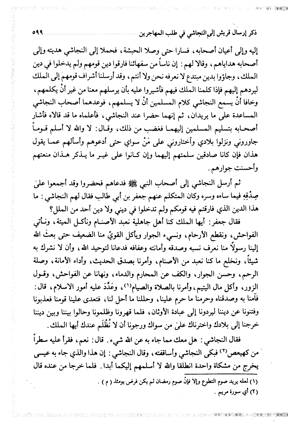 إليه وإلى أعيان أصحابه فسارا حتى وصلا الحبشة فحملا إلى النجاشي هديته وإلى أصحابه هداياهم وقالا لهم إن ناسا من سفهائنا فارقوا دين قومهم ولم يدخلوا في دين الملك وجاؤوا بدين مبتدع لا نعرفه نحن ولا أنتم وقد أرسلنا أشراف قومهم إلى الملك ليردهم إليهم فإذا كلمنا الملك فيهم فأشيروا عليه بأن يرسلهم معنا من غير أن يكلمهم وخافا أن يسمع النجاشي كلام المسلمين أن لا يسلمهم فوعدهما أصحاب النجاشي المساعدة على ما يريدان ثم إنهما حضرا عند النجاشي فأعلماه ما قد قالاه فأشار أصحابه بتسليم المسلمين إليهما فغضب من ذلك وقال لا والله لا أسلم قوما جاوروني ونزلوا بلادي واختاروني على من سواي حتى أدعوهم وأسألهم عما يقول هذان فإن كانا صادقين سلمتهم إليهما وإن كانوا على غير ما يذكر هذان منعتهم وأحسنت جوارهم