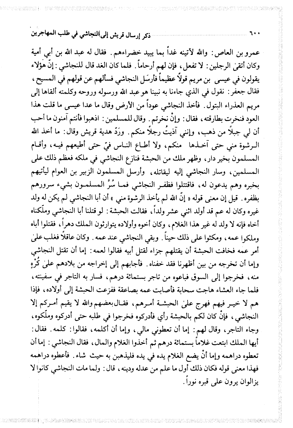عمرو بن العاص والله لآتينه غدا بما يبيد خضراءهم فقال له عبد الله بن أبي أمية وكان أتقى الرجلين لا تفعل فإن لهم أرحاما فلما كان الغد قال للنجاشي إن هؤلاء يقولون في عيسى بن مريم قولا عظيما فأرسل النجاشي فسألهم عن قولهم في المسيح فقال جعفر نقول في الذي جاءنا به نبينا هو عبد الله ورسوله وروحه وكلمته ألقاها إلى مريم العذراء البتول فأخذ النجاشي عودا من الأرض وقال ما عدى عيسى ما قلت هذا العود فنخرت بطارقته فقال وإن نخرتم وقال للمسلمين اذهبوا فأنتم آمنون ما أحب أن لي جبلا من ذهب وإنني آذيت رجلا منكم ورد هدية قريش وقال ما أخذ الله الرشوة مني حتى آخذها منكم ولا أطاع الناس في حتى أطيعهم فيه وأقام المسلمون بخير دار وظهر ملك من الحبشة فنازع النجاشي في ملكه فعظم ذلك على المسلمين وسار النجاشي إليه ليقاتله وأرسل المسلمون الزبير بن العوام ليأتيهم بخبره وهم يدعون له فاقتتلوا فظفر النجاشي فما سر المسلمون بشيء سرورهم بظفره قيل إن معنى قوله إن الله لم يأخذ الرشوة مني أن أبا النجاشي لم يكن له ولد غيره وكان له عم قد أولد اثني عشر ولدا فقالت الحبشة لو قتلنا أبا النجاشي وملكناه أخاه فإنه لا ولد له غير ذلك الغلام وكان أخوه وأولاده يتوارثون الملك دهرا فقتلوا أباه وملكوا عمه ومكثوا على ذلك حينا وبقي النجاشي عند عمه وكان عاقلا فغلب على أمر عمه فخافت الحبشة أن يقتلهم جزاء لقتل أبيه فقالوا لعمه إما أن تقتل النجاشي وإما أن تخرجه من بين أظهرنا فقد خفناه فأجابهم إلى إخراجه من بلادهم على كره منه فخرجوا إلى السوق فباعوه من تاجر بستمائة درهم فسار به التاجر في سفينته فلما جاء العشاء هاجت سحابة فأصابت عمه بصاعقة ففزعت الحبشة إلى أولاده فإذا هم لا خير فيهم فهرج على الحبشة أمرهم فقال بعضهم والله لا يقيم أمركم إلا النجاشي فإن كان لكم بالحبشة رأى فأدركوه فخرجوا في طلبه حتى أدركوه وملكوه وجاء التاجر وقال لهم إما أن تعطوني مالي وإما أن أكلمه فقالوا كلمه فقال أيها الملك ابتعت غلاما بستمائة درهم ثم أخذوا الغلام والمال فقال النجاشي إما أن تعطوه دراهمه وإما أن يضع الغلام يده في يده فليذهبن به حيث شاء فأعطوه دراهمه فهذا معنى قوله فكان ذلك أول ما علم من عدله ودينه قال ولما مات النجاشي كانوا لا يزالون يرون على قبره نورا