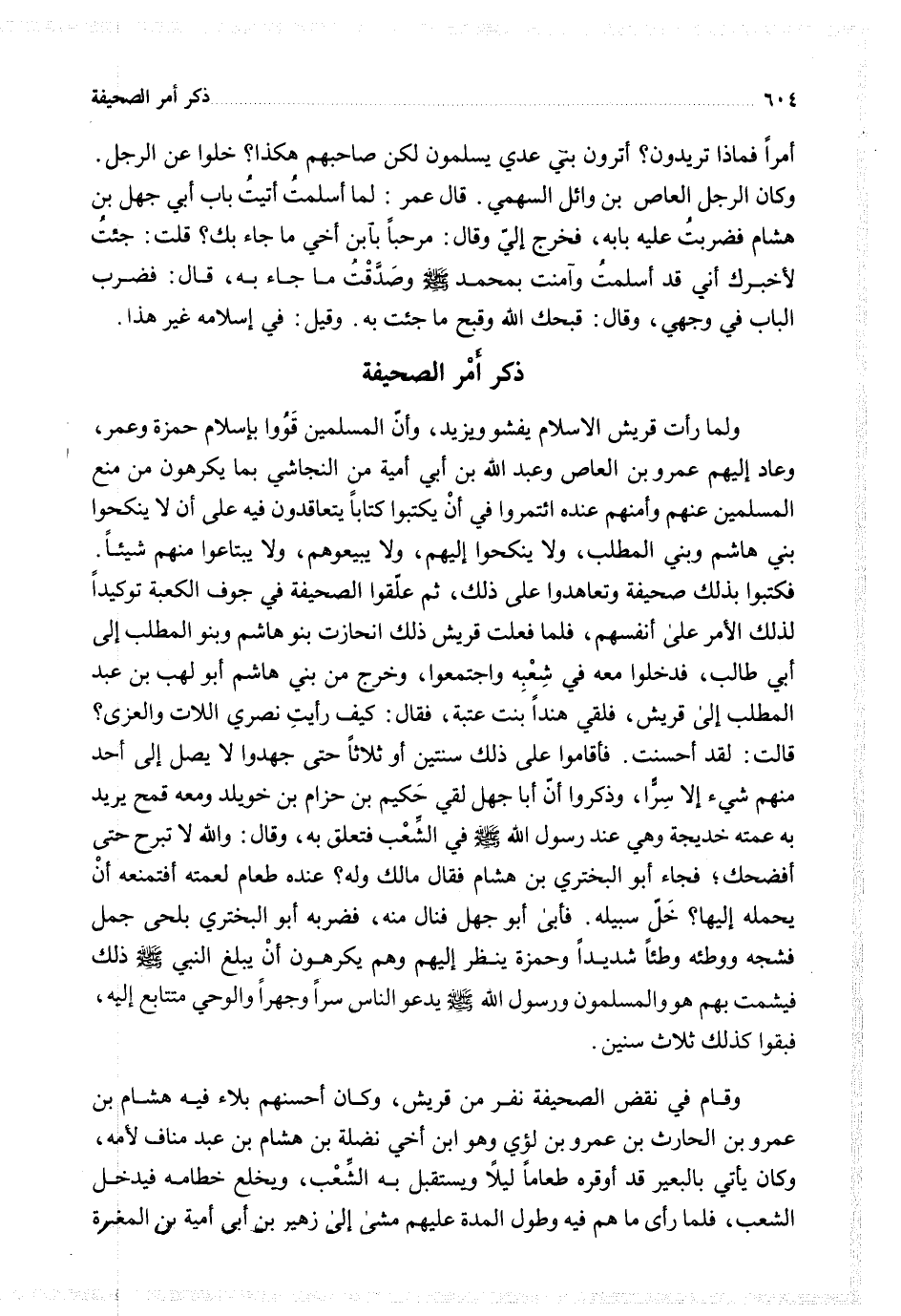 ولما رأت قريش الاسلام يفشو ويزيد وأن المسلمين قووا بإسلام حمزة وعمر وعاد إليهم عمرو بن العاص وعبد الله بن أمية من النجاشي بما يكرهون من منع المسلمين عنهم وأمنهم عنده ائتمروا في أن يكتبوا كتابا يتعاقدون فيه على أن لا ينكحوا بني هاشم وبني المطلب ولا ينكحوا إليهم ولا يبيعوهم ولا يبتاعون منهم شيئا فكتبوا بذلك صحيفة وتعاهدوا على ذلك ثم علقوا الصحيفة في جوف الكعبة توكيدا لذلك الأمر على أنفسهم فلما فعلت قريش ذلك انحازت بنو هاشم وبنو المطلب إلى أبي طالب فدخلوا معه في شعبه واجتمعوا وخرج من بني هاشم أبو لهب بن عبد المطلب إلى قريش فلقي هندا بنت عتبة فقال كيف رأيت نصري اللات والعزة قالت لقد أحسنت فأقاموا على ذلك سنتين أو ثلاثا حتى جهدوا لا يصل إلى أحد منهم شيء إلا سرا وذكروا أن أبا جهل لقي حكيم بن حزام بن خويلد ومعه قمح يريد به عمته خديجة وهي عند رسول الله في الشعب فتعلق به وقال والله لا تبرح حتى أفضحك فجاء أبو البختري بن هشام فقال مالك وله عنده طعام لعمته أفتمنعه أن يحمله إليها خل سبيله فأبى أبو جهل فنال منه فضربه أبو البختري بلحى جمل فشجه ووطئه وطئا شديدا وحمزة ينظر إليهم وهم يكرهون أن يبلغ النبي ذلك فيشمت بهم هو والمسلمون ورسول الله يدعو الناس سرا وجهرا والوحي متتابع إليه فبقوا كذلك ثلاث سنين