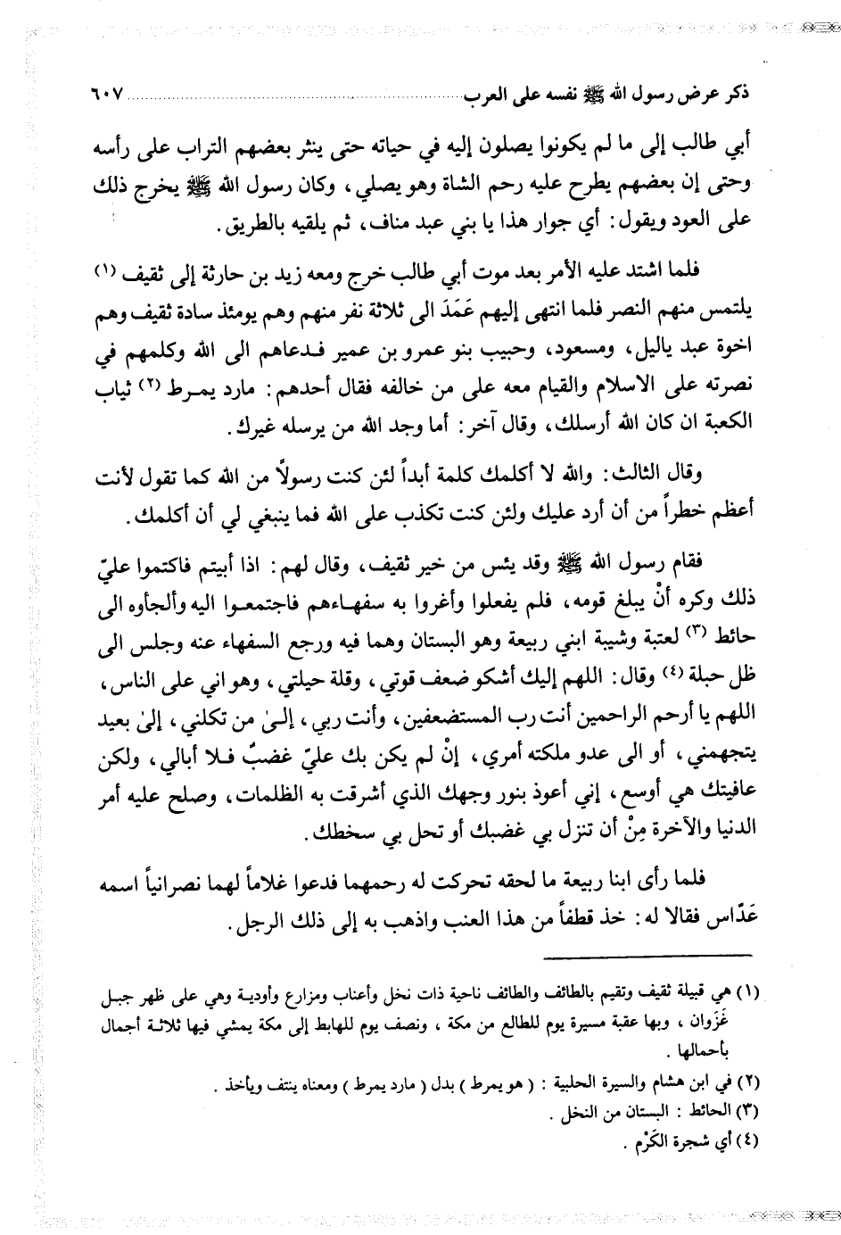 فقام رسول الله وقد يئس من خير ثقيف وقال لهم اذا أبيتم فاكتموا علي ذلك وكره أن يبلغ قومه فلم يفعلوا وأغروا به سفهاءهم فاجتمعوا إليه وألجأوه إلى حائط لعتبة وشيبة ابني ربيعة وهو البستان وهما فيه ورجع السفهاء عنه وجلس إلى ظل حبلة وقال الله إليك أشكو ضعف قوتي وقلة حيلتي وهو أني على الناس اللهم يا أرحم الراحمين أنت رب المستضعفين وأنت ربي إلى من تكلني إلى بعيد يتجهمني أو إلى عدو ملكته أمري إن لم يكن بك علي غضب فلا أبالي ولكن عافيتك هي أوسع إني أعوذ بنور وجهك الذي أشرقت به الظلمات وصلح عليه أمر الدنيا والآخرة من أن تنزل بي غضبك أو تحل بي سخطك