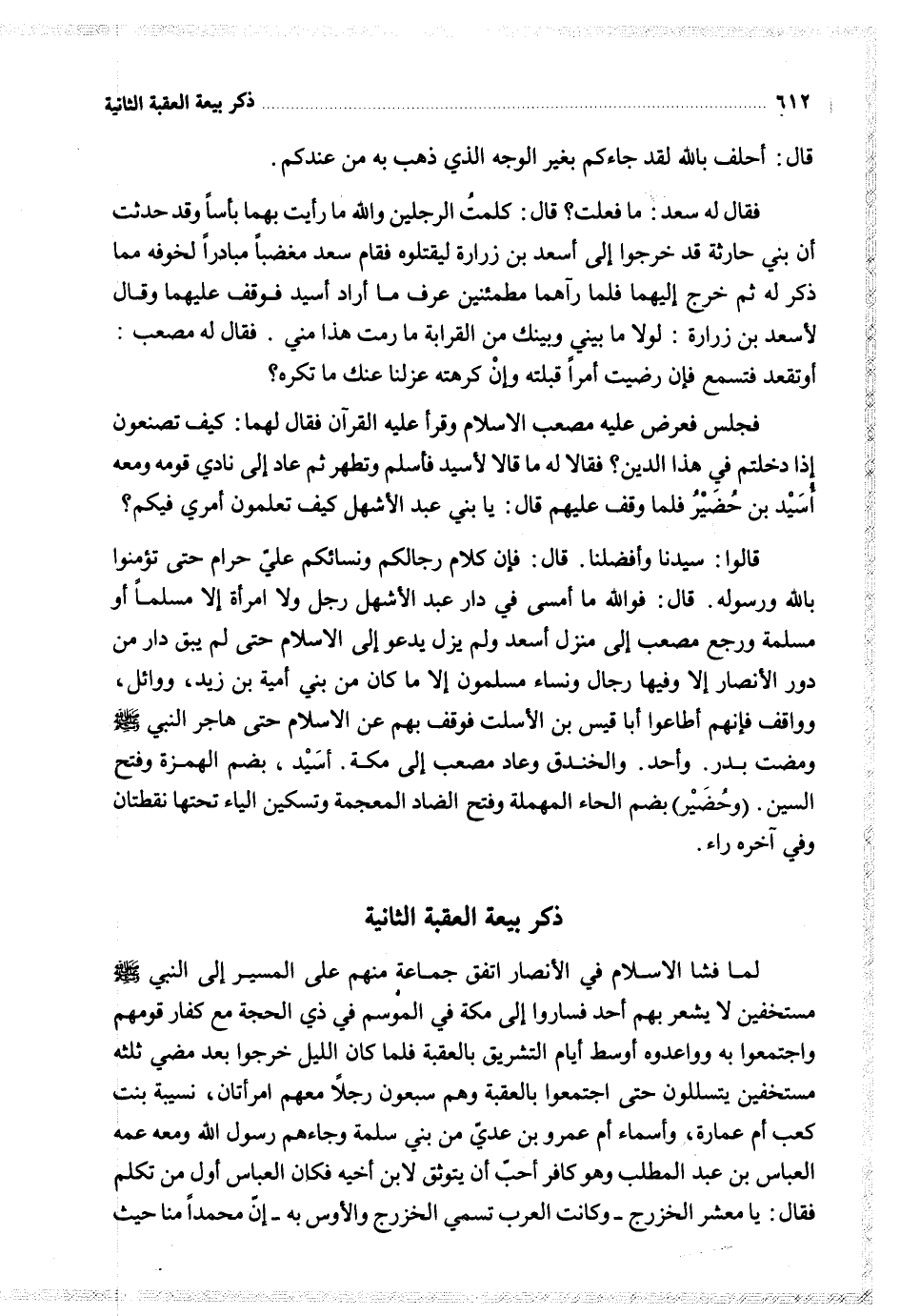 قالوا سيدنا وأفضلنا قال فإن كلام رجالكم ونسائكم علي حرام حتى تؤمنوا بالله ورسوله قال فوالله ما أمسى في دار عبد الأشهل رجل ولا امرأة إلا مسلما أو مسلمة ورجع مصعب إلى منزل أسعد ولم يزل يدعوا إلى الاسلام حتى لم يبق دار من دور الأنصار إلا وفيها رجال ونساء مسلمون إلا ما كان من بني أمية بن زيد ووائل وواقف فإنهم أطاعوا أبا قيس بن الأسلت فوقف بهم عن الاسلام حتى هاجر النبي ومضت بدر وأحد والخندق وعاد مصعب إلى مكة أسيد بضم الهمزة وفتح السين (وحضير) بضم الحاء المهملة وفتح الضاد المعجمة وتسكين الياء تحتها نقطتان وفي آخره راء