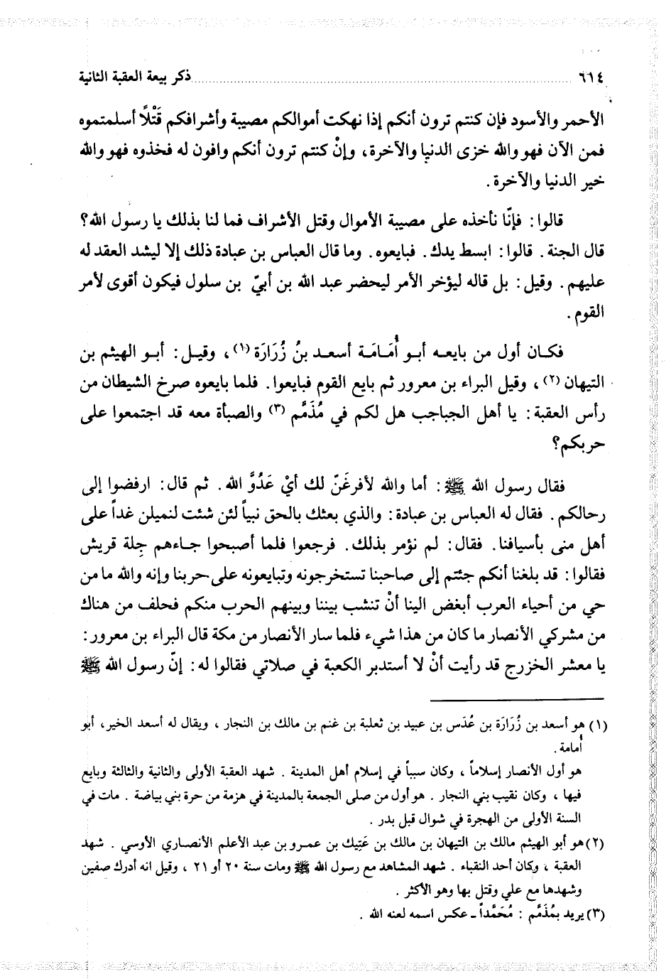 فقال رسول الله أما والله لأفرغن لك أي عدو الله ثم قال ارفضوا إلي رحالكم فقال له العباس بن عبادة والذي بعثك بالحق نبيا لئن شئت لنميلن غدا على أهل منى بأسيافنا فقال لم نؤمر بذلك فرجعوا فلما أصبحوا جاءهم جلة قريش فقالو قد بلغنا أنكم جئتم إلى صاحبنا تستخرجونه وتبايعونه على حربنا وإنه والله ما من حي من أحياء العرب أبغض إلينا أن تنشب بيننا وبينهم الحرب منكم فحلف من هناك من مشركي الأنصار ما كان من هذا شيء فلما سار الأنصار من مكة قال البراء بن معرور يا معشر الخزرج قد رأيت أن لا أستبدر الكعبة في صلاتي فقالوا له أن رسول الله