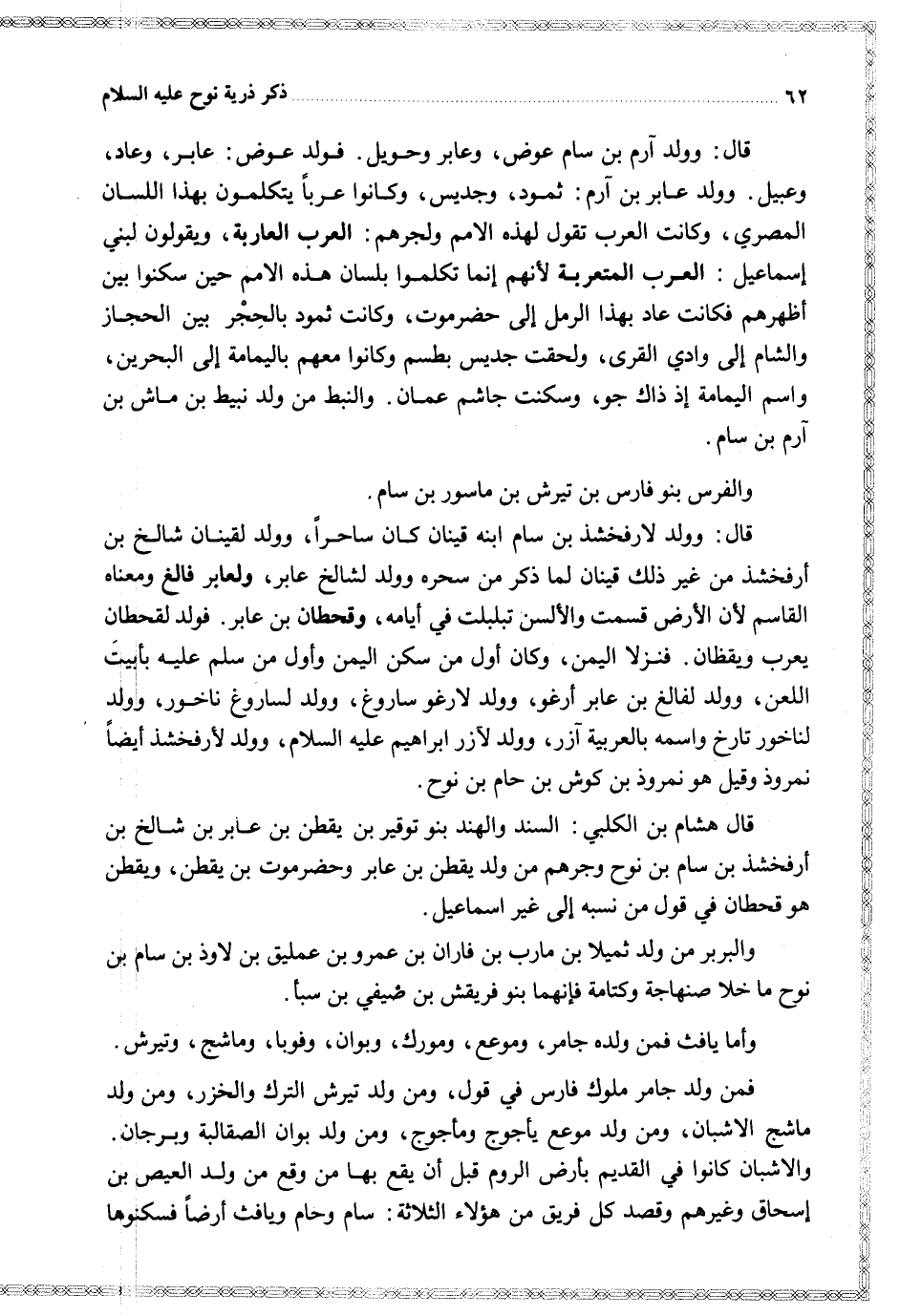 قال وولد لارفخشذ بن سام ابنه قينان كان ساحرا وولد لقينان شالخ بن أرفخشذ من غير ذلك فينان لما ذكر من سحره وولد لشالخ عابر ولعابر فالغ ومعناه القاسم لأن الأرض قسمت والألسن تبلبلت في أيامه وقحطان بن عابر فولد لقحطان يعرب ويقظان فنزلا اليمن وكان أول من سكن اليمن وأول من سلم عليه بأبيت اللعن وولد لفالغ بن عابر أرغو وولد لارغو ساروغ وولد لساروغ ناخور وولد لناخور تارخ واسمه بالعربية آزر وولد لآزر ابراهيم عليه السلام وولد لأرفخشذ أيضا نمروذ بن كوش بن حام بن نوح
