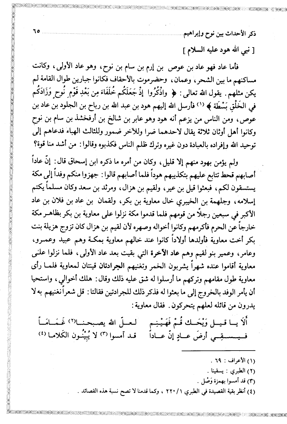 فأما عاد فهو عاد بن عوص بن إرم بن سام بن نوح وهو عاد الأولى وكانت مساكنهم ما بين الشحر وعمان وحضرموت بالأحقاف فكانوا جبارين طوال القامة لم يكن مثلهم يقول الله تعالى {واذكروا إذ جعلكم خلفاء من بعد قوم نوح وزادكم في الخلق بسطة} فأرسل الله إليهم هود بن عبد الله بن رباح بن الجلود بن عاد بن عوص ومن الناس من يزعم أنه هود وهو عابر بن شالخ بن أرفخشذ بن سام بن نوح وكانوا أهل أوثان ثلاثة يقال لأحدهما ضرا وللآخر ضمور وللثالث الهباء فدعاهم إلى توحيد الله وإفراده بالعبادة دون غيره وترك ظلم الناس فكذبوه وقالوا من أشد منا قوة