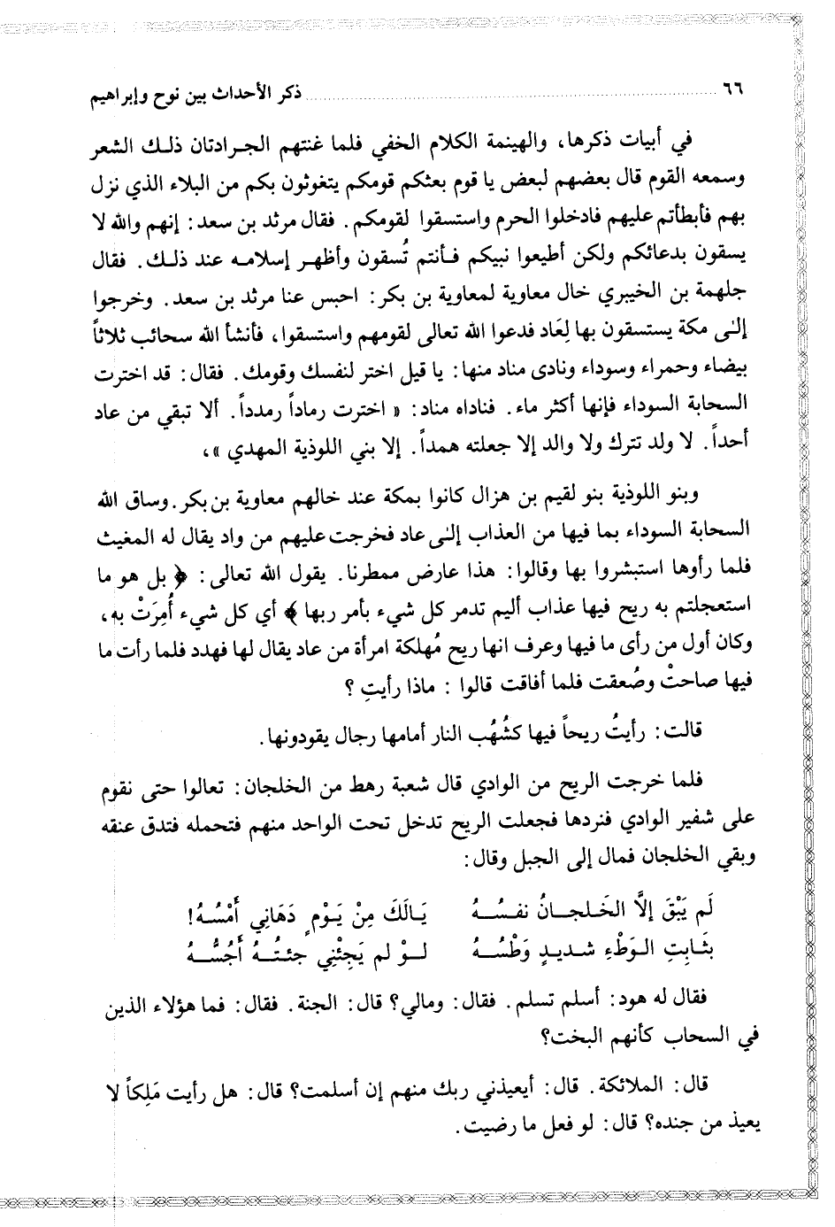 في أبيات ذكرها والهيمنة الكلام الخفي فلما غنتهم الجرادتان ذلك الشعر وسمعه القوم قال بعضهم لبعض يا قوم بعثكم قومكم يتغوثون بكم من البلاء الذي نزل بهم فأبطأتم عليهم ولكن أطيعوا نبيكم فأنتم تسقون وأظهر إسلامه عند ذلك فقال جلهمة بن الخيبري خال معاوية لمعاوية بن بكر احبس عنا مرثد بن سعد وخرجوا إلى مكة يستسقون بها لعاد فدعوا الله تعالى لقومهم واستسقوا فأنشأ الله سحائب ثلاثا بيضاء وحمراء وسوداء فإنها أكثر ماء فناداه مناد اخترت رمادا رمددا ألا تبقي من عاد أحدا لا ولد تترك ولا والد إلا جعلته همدا إلا بني اللوذية المهدي