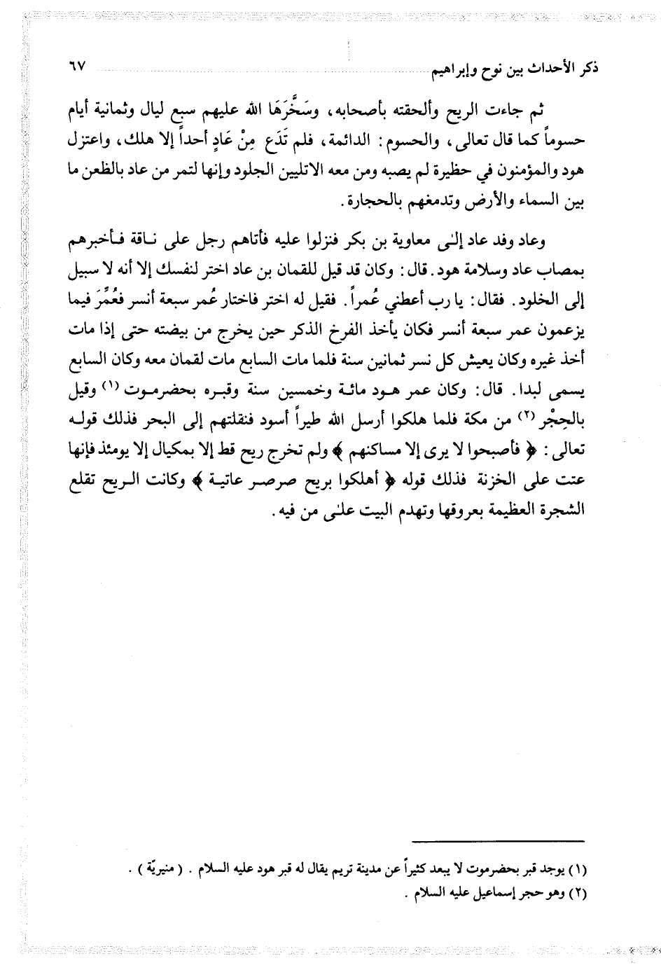 وعاد وفد عاد إلى معاوية بن بكر فنزلوا عليه فأتاهم رجل على ناقة فأخبرهم بمصاب عاد وسلامة هود قال وكان قد قيل للقمان بن عاد اختر لنفسك إلا أنه لا سبيل إلى الخلود فقال يا رب أعطني عمرا فقيل له اختر فاختار عمر سبعة انسر فعمر فيما يزعمون عمر سبعة أنسر فكان يأخذ الفرخ الذكر حين يخرج من بيضته حتى إذا مات أخذ غيره وكان يعيش كل نسر ثمانين سنة فلما مات السابع مات لقمان معه وكان السابع يسمى لبدا قال وكان عمر هود مائة وخمسين سنة وقبره بحضرموت وقيل بالحجر من مكة فلما هلكوا أرسل الله طيرا أسود فنقلتهم إلى البحر فذلك قوله تعالى { فأصبحوا لا يرى إلا مساكنهم } ولم تخرج ريح قط إلا بمكيال إلا يومئذ فإنها عتت على الخزنة فذلك قوله { فأهلكوا بريح صرصر عاتية } وكانت الريح تقلع الشجرة العظيمة بعروقها وتهدم البيت على من فيه