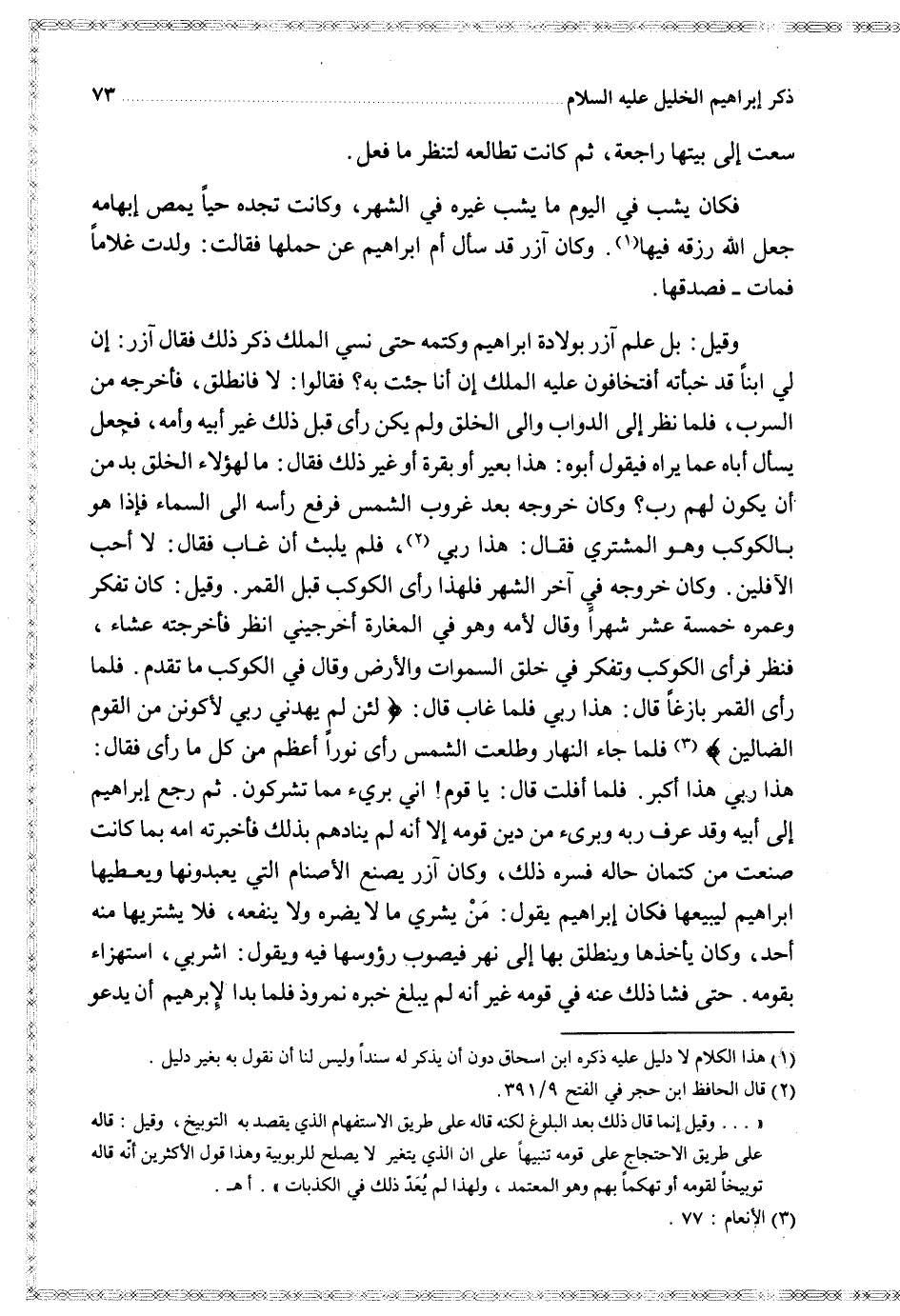 وقيل بل علم آزر بولادة إبراهيم وكتمه حتى نسي الملك ذكر ذلك فقال آزر إن لي أبنا قد خباته أفتخافون عليه الملك إن أنا جئت به فقالوا لا فانطلق فأخرجه من السرب فلما نظر إلى الدواب والى الخلق ولم يكن رأى قبل ذلك غير أبيه وأمه فجعل يسأل أباه عما يراه فيقول أبوه هذا بعير أو بقرة أو غير ذلك فقال مال هؤلاء الخلق بد من أن يكون لهم رب وكان خروجه بعد غروب الشمس فرفع رأسه الى السماء فإذا هو بالكوكب وهو المشتري فقال هذا ربي فلم يلبث أن غاب فقال لا أحب الآفلين وكان خروجه في آخر الشهر فلهذا رأى الكوكب قبل القمر وقيل كان تفكر وعمره خمسة عشر شهرا وقال لأمه وهو في المغارة أخرجيني انظر فأخرجته عشاء فنظر فرأى الكوكب وتفكر في خلق السماوات والأرض وقال في الكواكب ما تقدم فلما رأى القمر بازغا قال هذا ربي فلما غاب قال { لئن لم يهدني ربي لأكونن من القوم الضالين } فلما جاء النهار وطلعت الشمس رأى نورا أعظم من كل ما رأى فقال هذا ربي هذا أكبر فلما أفلت قال يا قوم أني برئ مما تشركون ثم رجع إبراهيم إلى أبيه وقد عرف ربه وبرئ من دين قومه إلا أنه لم ينادهم بذلك فأخبرته أمه بما كانت صنعت من كتمان حاله فسره ذلك وكان آزر يصنع الأصنام التي يعبدونها ويعطيها إبراهيم ليبيعها فكان إبراهيم يقول من يشري مالا يضره ولا ينفعه فلا يشتريها منه أحد وكان يأخذها وينطلق بها إلى نهر فيصوب رؤسها فيه ويقول أشربي استهزاء بقومه حتى فشا ذلك عنه في قومه غير أنه لم يبلغ خبره نمروذ فلما بدا لإبراهيم أن يدعو