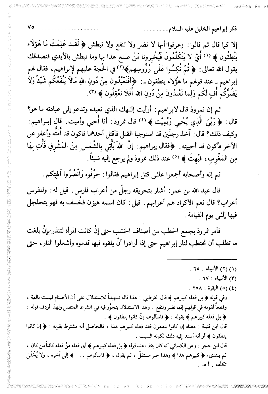 ثم إن نمروذ قال لإبراهيم أرأيت إلهك الذي تعبده وتدعو إلى عبادته ما هو قال { ربي الذي يحيي ويميت } قال نمروذ أنا أحيي وأميت قال إبراهيم وكيف ذلك قال آخذ رجلين قد استوجبا القتل فأقتل أحدهما فاكون قد أمته وأعفو عن الآخر فأكون قد أحييته { قال إبراهيم فإن الله يأتي بالشمس من المشرق فأت بها من المغرب فبهت } عند ذلك نمروذ ولم يرجع إليه شيئا