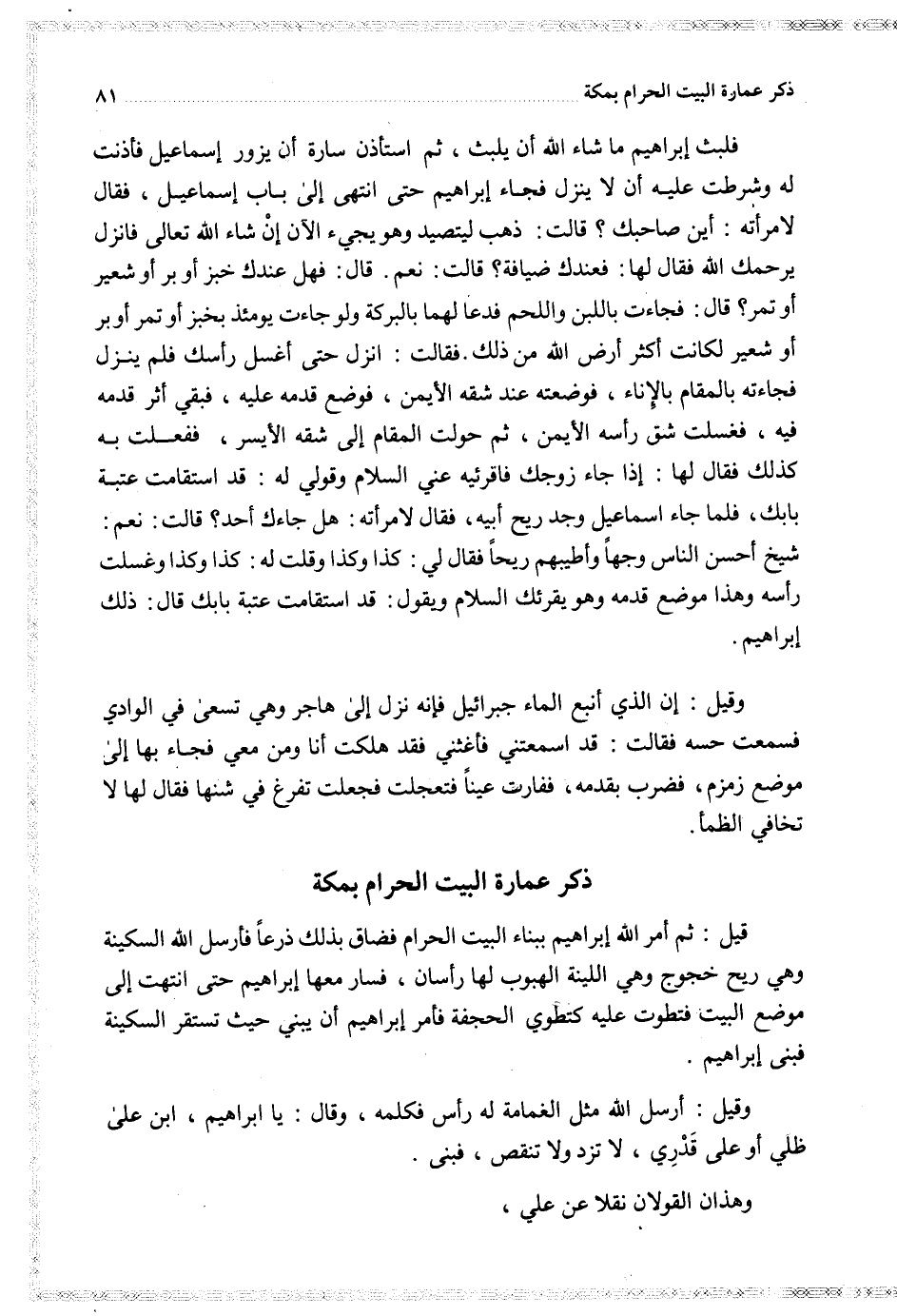 فلبث إبراهيم ما شاء الله أن يلبث ثم استأذن سارة أن يزور إسماعيل فأذنت له وشرطت عليه أن لا ينزل فجاء إبراهيم حتى انتهى إلى باب إسماعيل فقال لامرأته أين صاحبك قالت ذهب ليتصيد وهو يجئ الآن إن شاء الله تعالى فانزل يرحمك الله فقال لها فعندك ضيافة قالت نعم قال فهل عندك خبز أو بر أو شعير أو تمر قال فجاءت بالبن واللحم فدعا لهما بالبركة ولو جاءت يومئذ بخبز أو تمر أو بر أو شعير لكانت أكثر أرض الله من ذلك فقالت انزل حتى أغسل رأسك فلم ينزل فجاءته بالمقام بالإناء فوضعته عند شقه الأيمن فوضع قدمه عليه فيقي أثر قدمه فيه فغسلت شق رأسه الأيمن ثم حولت المقام إلى شقه الأيسر ففعلت به كذلك فقال لها إذا جاء زوجك فاقرئيه عني السلام وقولي له قد استقامت عتبة بابك فلما جاء إسماعيل وجد ريح أبيه فقال لامرأته هل جاءك أحد قالتنعم شيخ أحسن الناس وجها وأطيبهم ريحا فقال لي كذا وكذا وقلت له كذا وكذا وغسلت رأسه وهذا موضع قدمه وهويقرئك السلام ويقول قد استقامت عتبة بابك قال ذلك إبراهيم