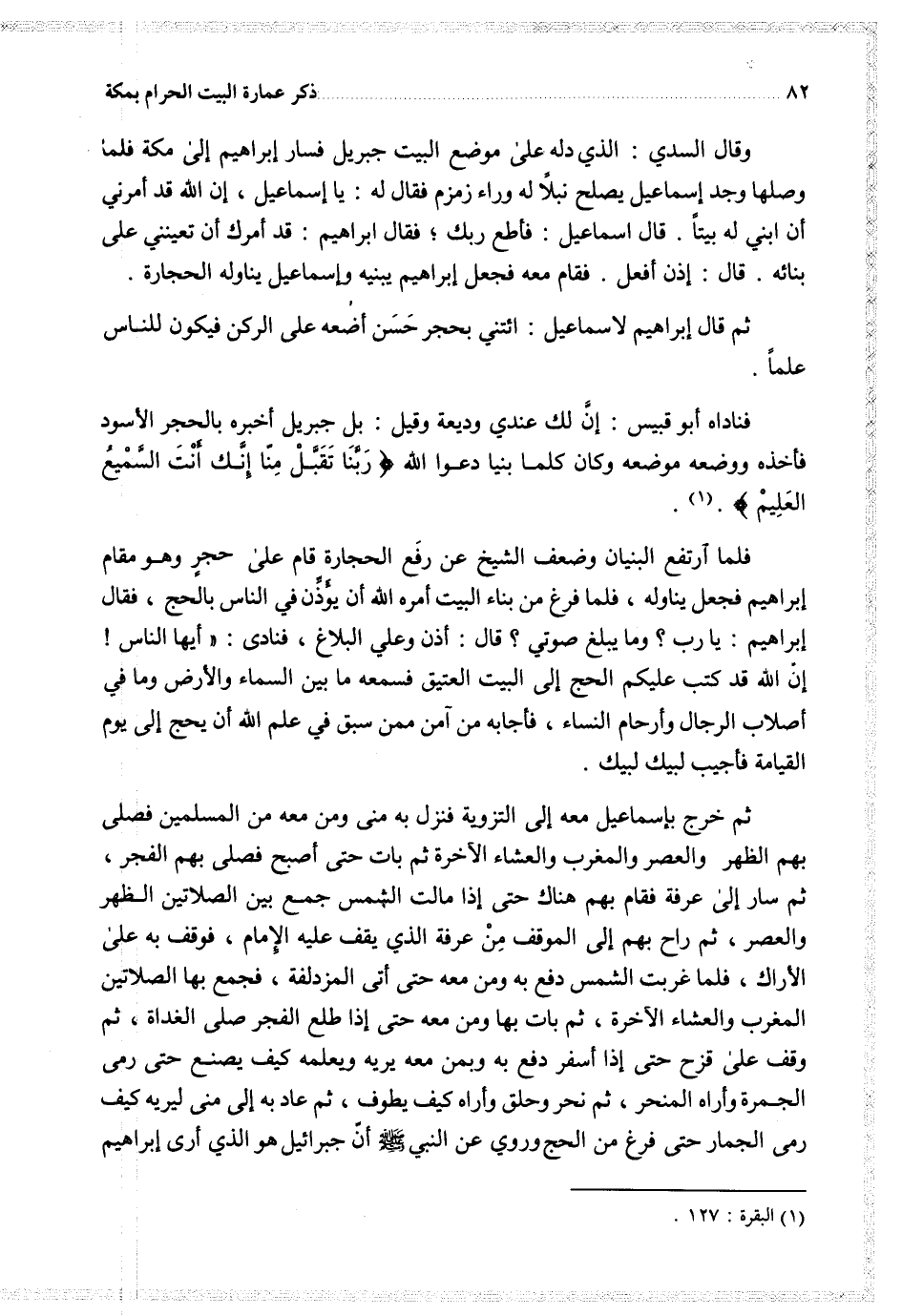 ثم خرج بإسماعيل معه إلى التزوية فنزل به منى ومن معه من المسلمين فصلى بهم الظهر والعصر والمغرب والعشاء الآخرة ثم بات حتى أصبح فصلى بهم الفجر ثم سار إلى عرفة فقام هناك حتى إذا مالت الشمس جمع بين الصلاتين الظهر والعصر ثم راح بهم إلى الموقف من عرفة الذي يقف عليه الإمام فوقف به على الأراك فلما غربت الشمس دفع به ومن معه حتى أتى المزدلفة فجمع بها الصلاتين المغرب والعشاء الآخرة ثم بات بها ومن معه حتى إذا طلع الفجر صلى الغداة ثم وقف على قزح حتى إذا أسفر دفع بخ وبمن معه يريه ويعلمه كيف يصنع حتى رمى الجمرة وأراه المنجر ثم نحر وحلق وأراه كيف يطوف ثم عاد به إلى منى ليريه كيف رمى الجمار حتى فرغ من الحج وروي عن النبي أنجبرائيل هو الذي أرى إبراهيم