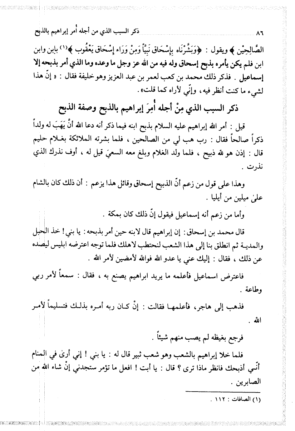 ويقول {فبشرناها بإسحاق ومن وراء إسحاق يعقوب} بإبن وابن ابن فلم يكن يأمره بذبح إسحاق وله فيه من الله عز وجل ما وعده وما الذي أمر بذبحه إلا إسماعيل فذكر ذلك محمد بن كعب لعمر بن عبد العزيز وهو خليفة فقال إن هذا لشيء ما كنت أنظر فيه وإني لأراه كما قلت