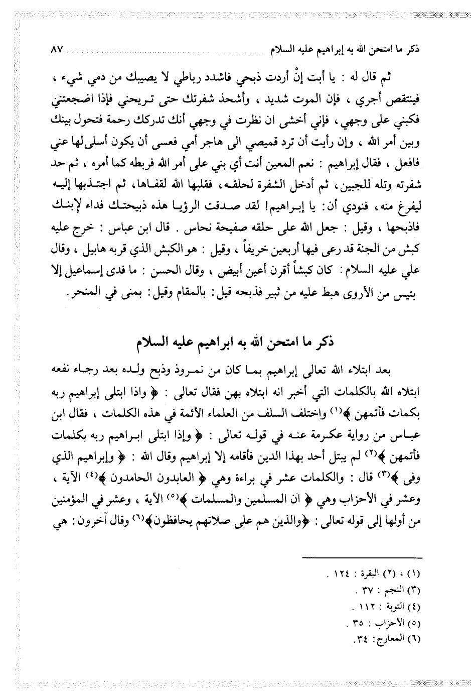 بعد ابتلاء الله تعالى إبراهيم بما كان من نمروذ وذبح ولده بعد رجاء نفعه ابتلاه الله بالكلمات التي أخبر أنه ابتلاه بهن فقال تعالى {وإذ ابتلى إبراهيم ربه بكلمات فأتمهن} واختلف السلف من العلماء الأئمة في هذه الكلمات فقال ابن عباس من رواية عكرمة عنه في قوله تعالى {وإذ ابتلى إبراهيم ربه بكلمات فأتمهن} لم يبتل أحد بهذا الدين فأقامه إلا إبراهيم وقال الله {وإبراهيم الذي وفى} قال والكلمات عشر في براءة وهي {العابدون الحامدون} الآية وعشر في الأحزاب وهي {إن المسلمين والمسلمات} الآية عشر في المؤمنين من أولها إلى قوله تعالى {والذين هم على صلاتهم يحافظون} وقال آخرون هي