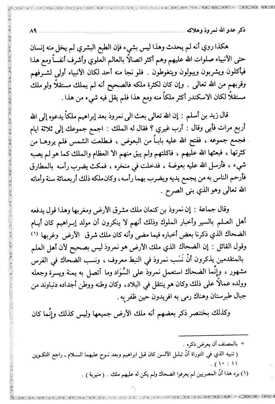 وقال جماعة إن نمروذ بن كنعان ملك مشرق الأرض ومغربها وهذا قول يدفعه أهل العلم باليسر وأخبار الملوك وذلك أنهم لا ينكرون أن مولد إبراهيم كان أيام الضحاك الذي ذكرنا بعض أخباره فيما مضى وأنه كان ملك شرق الأرض وغربها وقول القائل إن الضحاك الذي ملك الأرض هو نمروذ ليس بصحيح لأن أهل العلم بالمتقدمين يذكرون أن نسب نمروذ في النبط معروف ونسب الضحاك في الفرس مشهور وإنما الضحاك استعمل نمروذ على السواد وما اتصل به يمنة ويسرة وجعله وولده عمالا على ذلك وكان هو ينتقل في البلاد وكان وطنه ووطن أجداده دنباوند من جبال طبرستان وهناك رمى به افريدون حين ظفر به