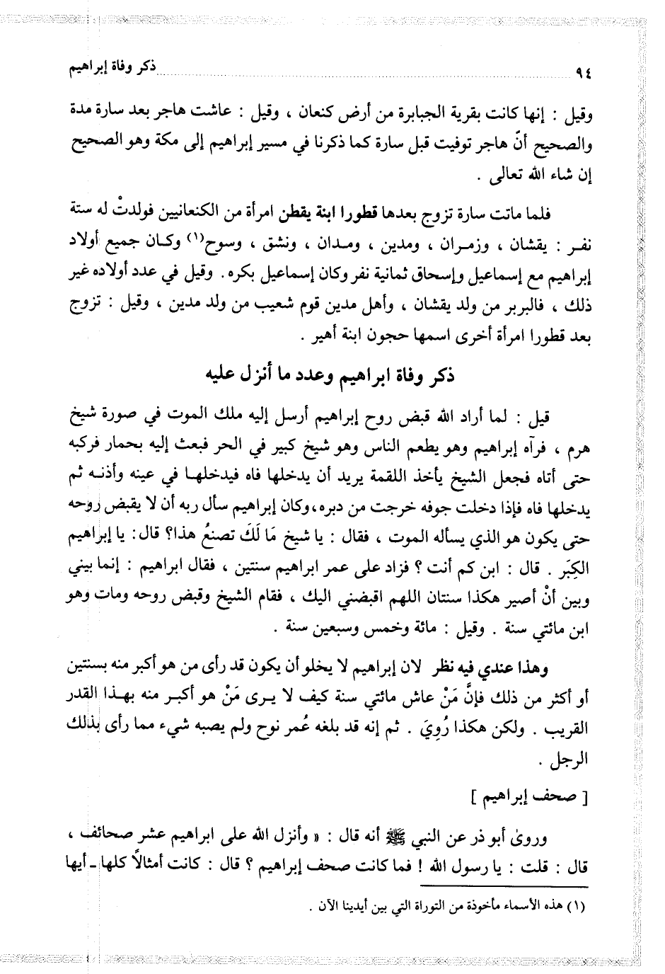 فلما ماتت سارة تزوج بعدها قطورا ابنة يقطن امرأة من الكنعانيين فولدت له ستة نفر يقشان وزمران ومدين ومدان ونشق وسوح وكان جميع أولاد إبراهيم مع إسماعيل وإسحاق وثمانية نفر وكان إسماعيل بكره وقيل في عدد أولاده غير ذلك فالبربر من ولد يقشان وأهل مدين قوم شعيب من ولد مدين وقيل تزوج بعد قطورا امرأة أخرى اسمها حجون ابنة أهير