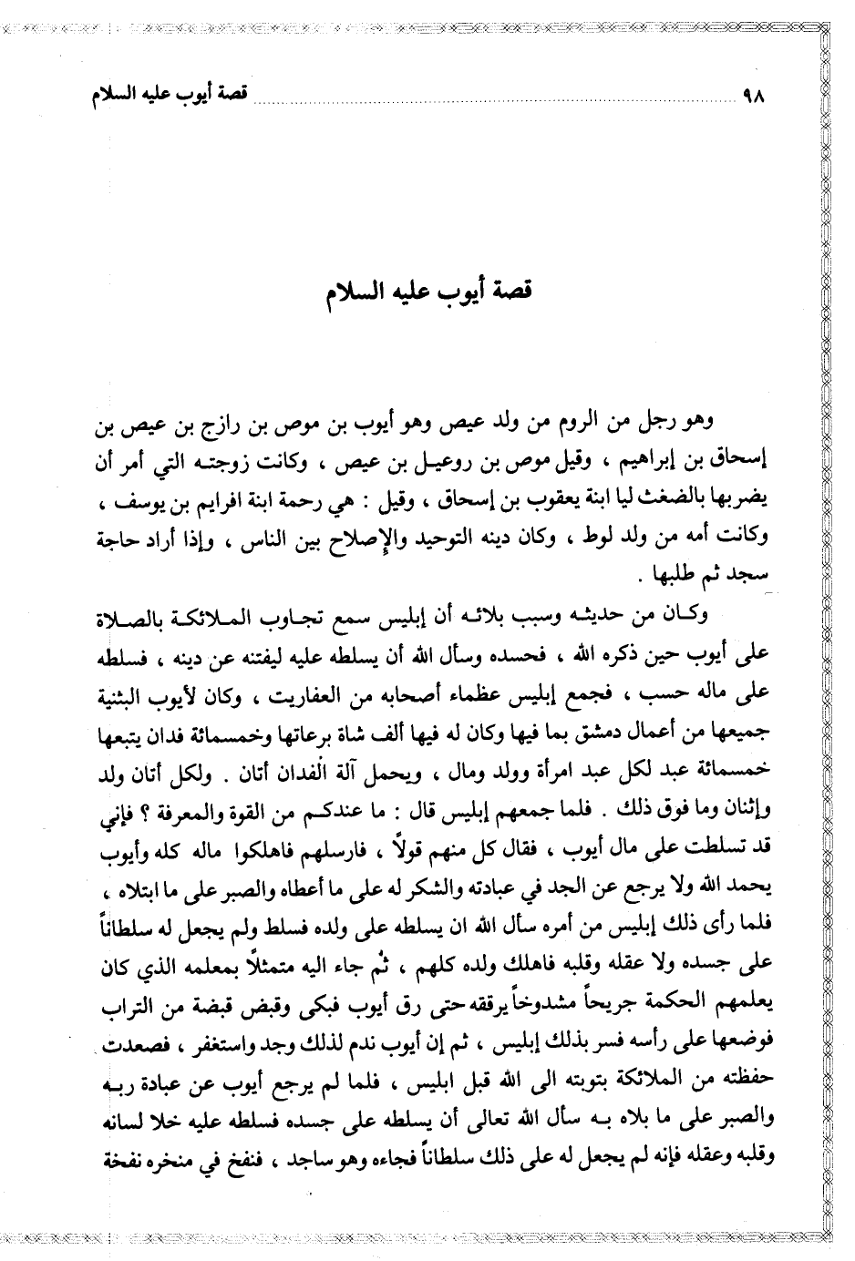 وكان من حديثه وسبب بلائه أن إبليس سمع تجاوب الملائكة بالصلاة على أيوب حين ذكره الله فحسده وسأل الله أن يسلطه عليه لفتنه عن دينه فسلطه على ماله حسب فجمع إبليس عظماء أصحابه من العفاريت وكان لأيوب البثنية جميعها من أعمال دمشق بما فيها وكان له فيها ألف شاة برعاتها وخمسمائة فدان يتبعها خمسمائة عبد لكل عبد امرأة وولد ومال ويحمل آله الفدان أتان ولد وإثنان وما فوق ذلك فلما جميعهم إبليس قال ما عندكم من القوة والمعرفة فإني قد تسلطت على مال أيوب فقال كل منهم قولا فارسلهم فاهلكوا ماله كله وأيوب يحمد الله ولا يرجع عن الجد في عبادته والشكر له على ما أعطاه والصبر على ما ابتلاه فلما رأى إبليس من أمره سأل الله أن يسلطه على ولده فسلط ولم يجعل له سلطانا على جسده ولا عقله وقلبه فاهلك ولده كلهم ثم جاء إليه متمثلا بمعلمه الذي كان يعلمهم الحكمة جريحا مشدوخا يرققه حتى رق أيوب فبكى وقبض قبضة من التراب فوضعها على رأسه فسر بذلك إبليس ثم إن أيوب ندم لذلك وجد واستغفر فصعدت حفظته من الملائكة بتوبته إلى الله قبل ابليس فلما لم يرجع أيوب عن عبادة ربه والصبر على ما بلاه به سأل الله تعالى أن يسلطه على جسده فسلطه عليه خلا لسانه وقلبه وعقله فإنه لم يجعل له على ذلك فجاءه وهو ساجد فنفخ في منخره نفخة