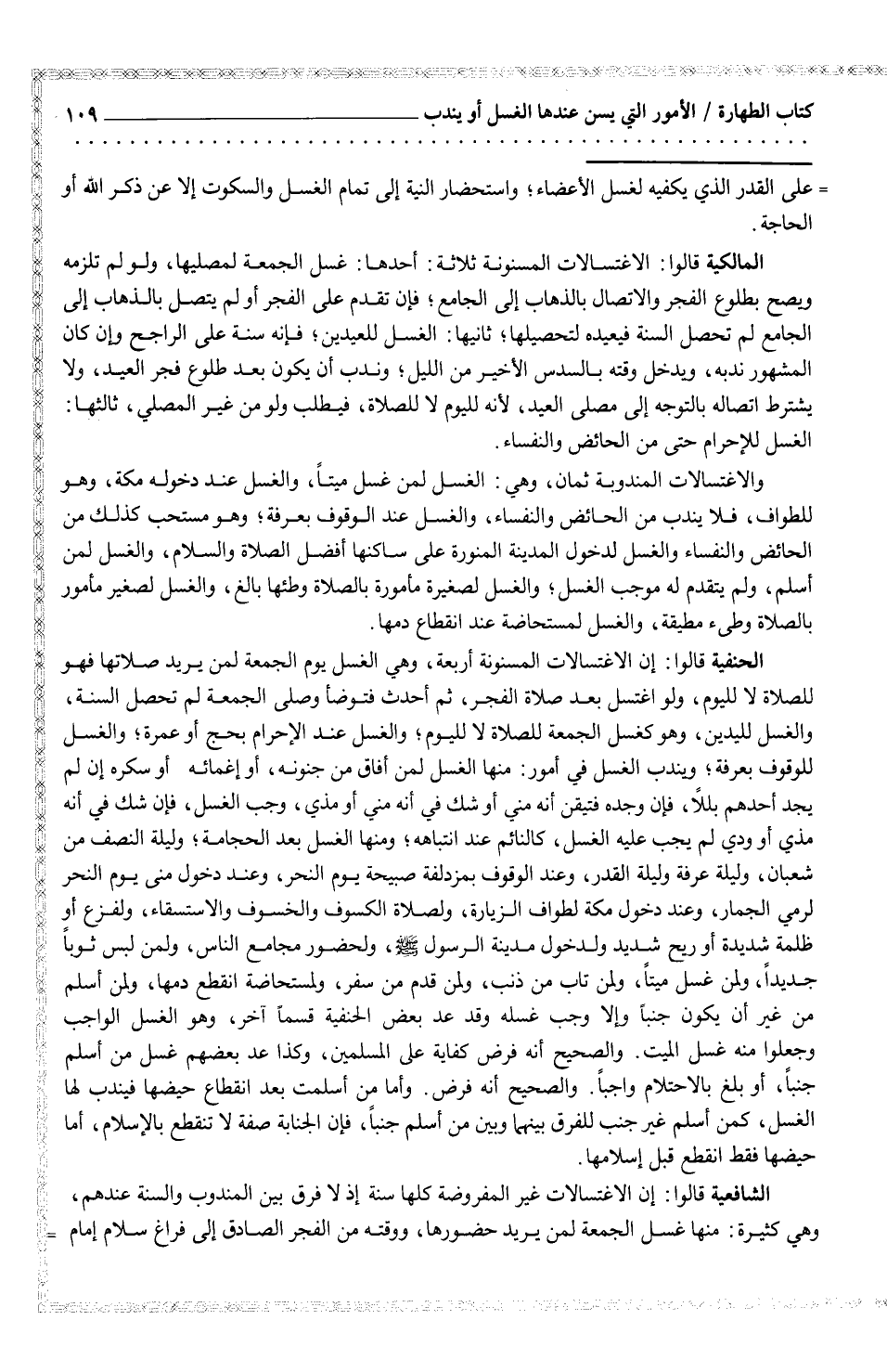المالكية قالوا: الاغتسالات المسنونة ثلاثة: أحدها: غسل الجمعة لمصليها، ولو لم تلزمه ويصح بطلوع الفجر والاتصال بالذهاب إلى الجامع؛ فإن تقدم على الفجر أو لم يتصل بالذهاب إلى الجامع لم تحصل السنة فيعيده لتحصيلها؛ ثانيها: الغسل للعيدين؛ فإنه سنة على الراجح وإن كان المشهور ندبه، ويدخل وقته بالسدس الأخير من الليل؛ وندب أن يكون بعد طلوع فجر العيد، ولا يشترط اتصاله بالتوجه إلى مصلى العيد، لأنه لليوم لا للصلاة، فيطلب ولو من غير المصلي، ثالثها: الغسل للإحرام حتى من الحائض والنفساء.