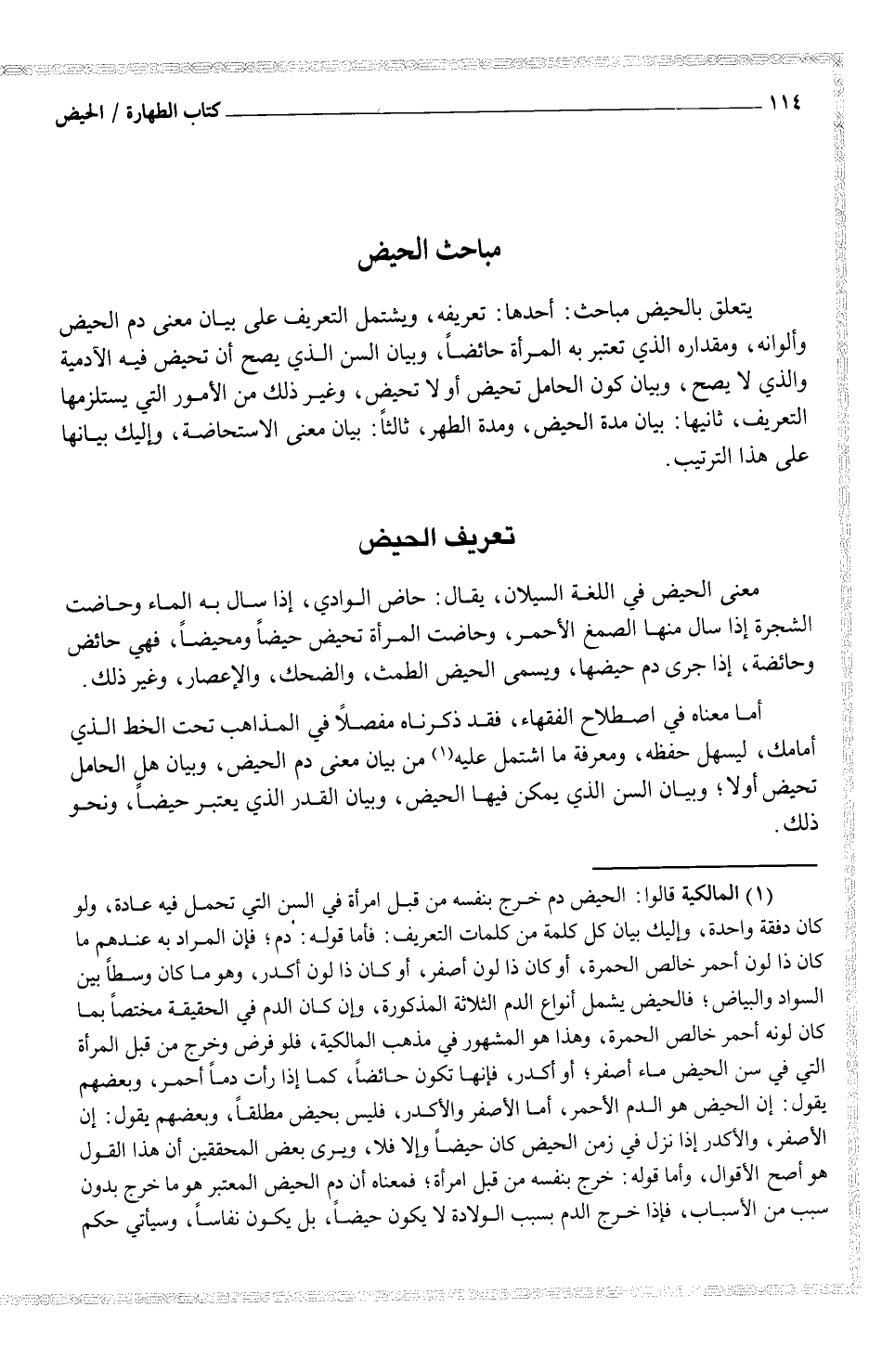 يتعلق بالحيض مباحث: أحدها: تعريفه، ويشتمل التعريف على بيان معنى دم الحيض وألوانه، ومقداره الذي تعتبر به المرأة حائضاً، وبيان السن الذي يصح أن تحيض فيه الآدمية والذي لا يصح، وبيان كون الحامل تحيض أو لا تحيض، وغير ذلك من الأمور التي يستلزمها التعريف، ثانيها: بيان مدة الحيض، ومدة الطهر، ثالثاً: بيان معنى الاستحاضة، وإليك بيانها على هذا الترتيب.