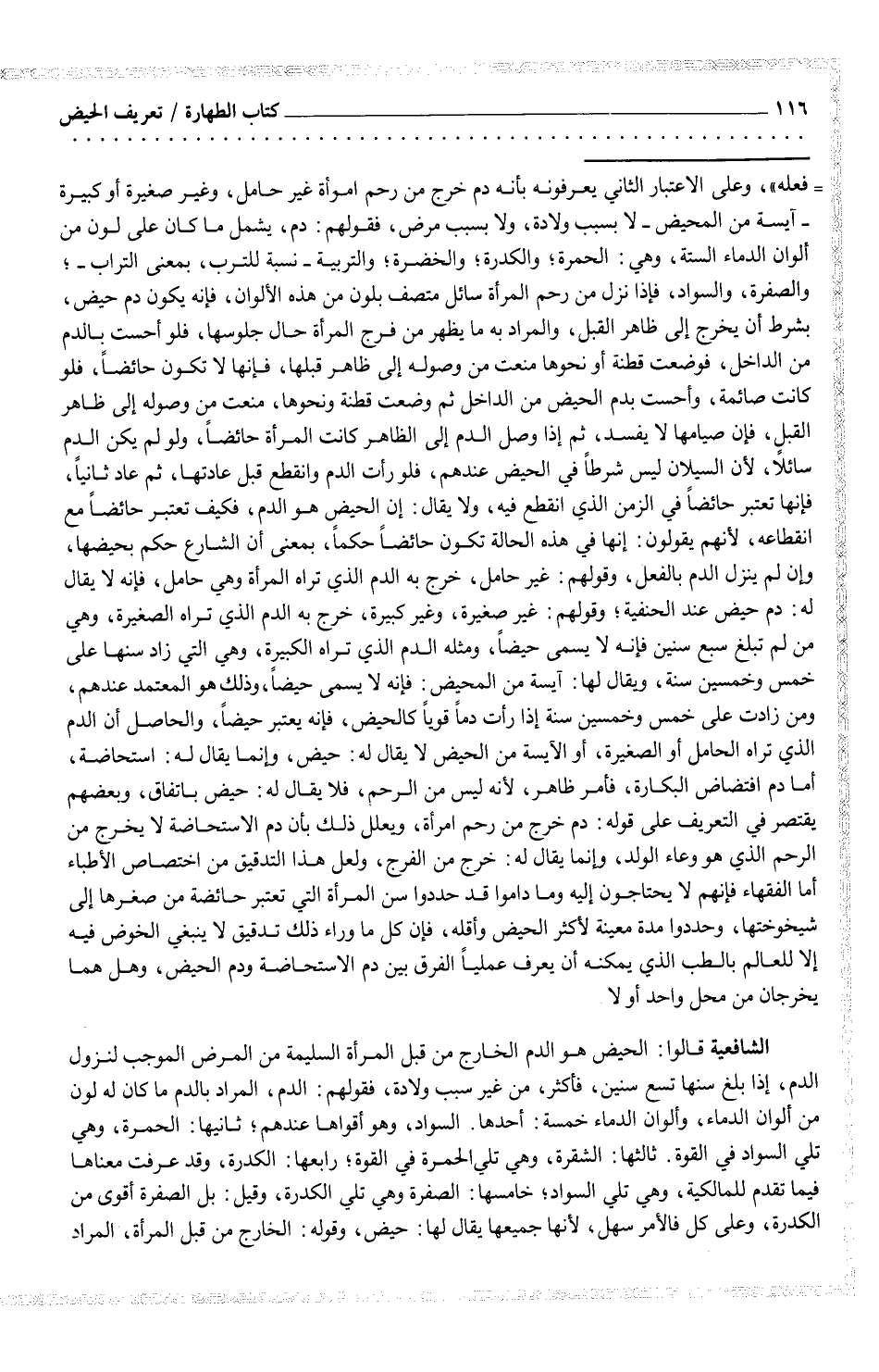 الشافعية قالوا: الحيض هو الدم الخارج من قبل المرأة السليمة من المرض الموجب لنزول الدم، إذا بلغ سنها تسع سنين، فأكثر، من غير سبب ولادة، فقولهم: الدم، المراد بالدم ما كان له لون من ألوان الدماء، وألوان الدماء خمسة: أحدها: السواد، وهو أقواها عندهم؛ ثانيها: الحمرة، وهي تلي السواد في القوة: ثالثها: الشقرة، وهي تلي الحمرة في القوة؛ ورابعها: الكدرة، وقد عرفت معناها فيما تقدم للمالكية، وهي تلي السواد؛ خامسها: الصفرة وهي تلي الكدرة، وقيل: بل الصفرة أقوى من الكدرة، وعلى كل فالأمر سهل، لأنها جميعها يقال لها: حيض، وقوله: الخارج من قبل المرأة، المراد
