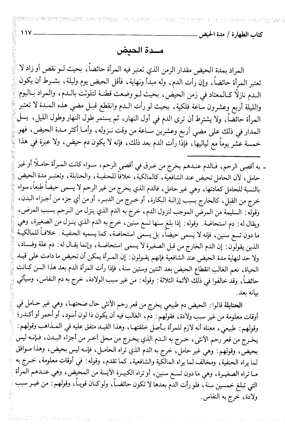الحنابلة قالوا: الحيض دمطبيعي يخرج من قعر رحم الأنثى حال صحتها، وهي غير حامل في أوقات معلومة من غير سبب ولادة، فقولهم: دم، الغالب فيه أن يكون ذا لون أسود، أو أحمر أو أكدر؛ وقولهم: طبيعي، معناه أنه لازم للمرأة بأصل خلقتها، وهذا القيد متفق عليه في المذاهب وقولهم: يخرج من قعر رحم الأنثى، خرج به الدم الذي يخرج من محل آخر من أجزاء البدن، فإنه ليس بحيض، وقولهم: وهي غير حامل، خرج به الدم الذي تراه الحامل، فإنه ليس بحيض، وهذا موافق لما يراه الحنفية، ومخالف لما يراه المالكية والشافعية، كما تقدم، وقوله: في أوقات معلومة، خرج به ما تراه الصغيرة، وهي ما دون تسع سنين، أو تراه الكبيرة الآيسة من المحيض، وهي عندهم المرأة التي تبلغ خمسين سنة، فلو رأت الدم بعدها لا تكون حائضاً، ولو كان قوياً، وقولهم: من غير سبب ولادة، خروج به النفاس
