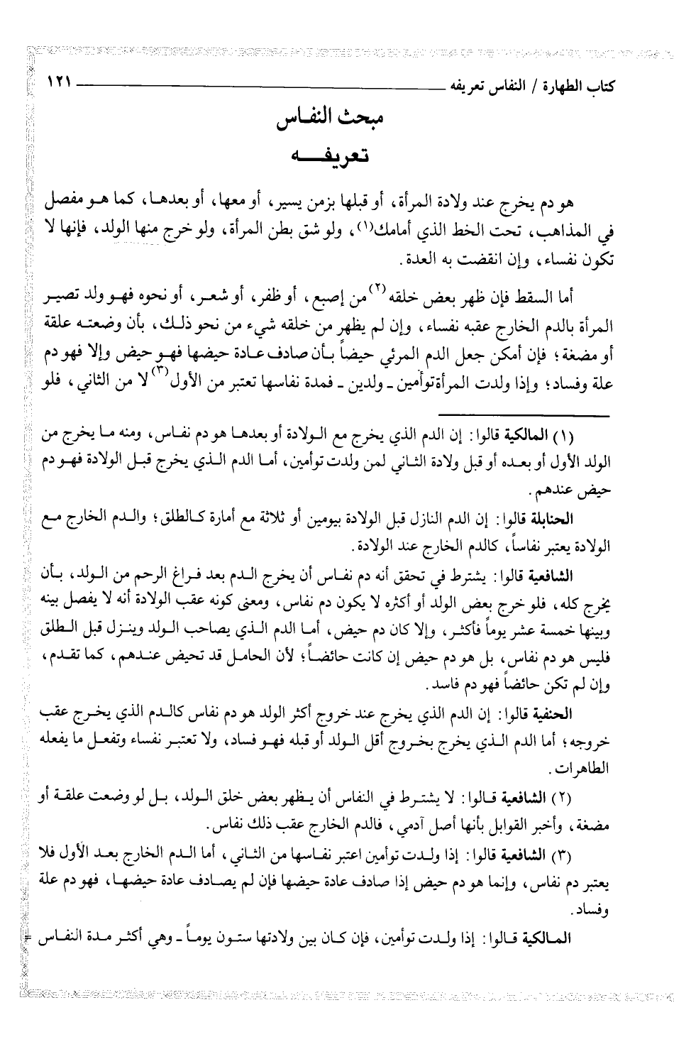 هو دم يخرج عند ولادة المرأة، أو قبلها بزمن يسير، أو معها، أو بعدها، كما هو مفصل في المذاهب، تحت الخط الذي أمامك (¬1) ، ولو شق بطن المرأة، ولو خرج منها الولد، فإنها لا تكون نفساء، وإن انقضت به العدة.