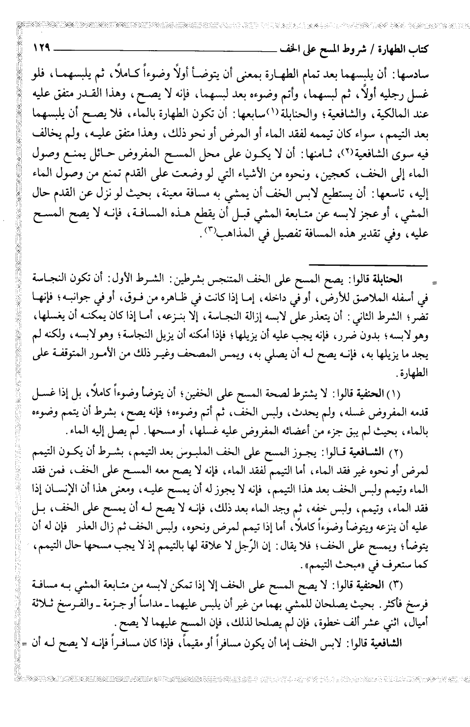 سادسها: أن يلبسهما بعد تمام الطهارة بمعنى أن يتوضأ أولاً وضوءاً كاملاً، ثم يلبسهما، فلو غسل رجليه أولاً، لم لبسهما، وأتم وضوءه بعد لبسهما، فإنه لا يصح، وهذا القدر متفق عليه عند المالكية، والشافعية؛ والحنابلة (¬1) سابعها: أن تكون الطهارة بالماء، فلا يصح أن يلبسهما بعد التيمم، سواء كان تيممه لفقد الماء أو المرض أو نحو ذلك، وهذا متفق عليه، ولم يخالف فيه سوى الشافعية (¬2) ، ثامنها: أن لا يكون على محل المسح المفروض حائل يمنع وصول الماء إلى الخف، كعجين، ونحوه من الأشياء التي لو وضعت على القدم تمنع من وصول الماء إليه، تاسعها: أن لا يستطيع لابس الخف أن يمشي به مسافة معينة، بحيث لو نزل عن القدم حال المشي، أو عجز لابسه عن متابعة المشي قبل أن يقطع هذه المسافة، فإنه لا يصح عليه، وفي تقدير هذه المسافة تفصيل في المذاهب (7) .