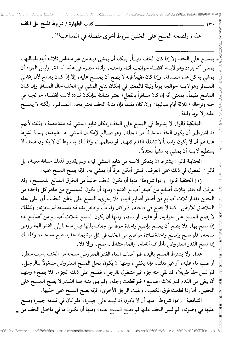 (¬1) الحنفية قالوا: زادوا شروطاً: منها أن يكون الخف خالياً من الخرق المانع للمسح، وقد عرفت أن يقدر بثلاث أصابع من أصغر أصابع القدم؛ ومنها أ، يكون الممسوح من ظاهر كل واحدة من الخفين مقدار ثلاث أصابع من أصغر من أصابع اليد؛ فلا يجزئ المسح على باطن الخف - أي على نعله الملاصق للأرض - كما لا يصح في داخله، فلو كان واسعاً، وادخل يده فيه ومسح لم يجزئه، وكذلك لا يصح المسح على جوانبه، أو عقبه، أو ساقه؛ ومنها أن يكون المسح بثلاث أصابع من أصابع يده إذا مسح بها، فلا يصح أن يمسح بإصبع واحدة خوفاً من جفاف بللها قبل مدها إلى القدر المفروض مسحه، فلو مسح بإصبع واحدة ثلاثة مواضع من الخف في كل مرة بماء جديد صح مسحه؛ وكذلك إذا مسح القدر المفروض بأطراف أنامله، والماء متقاطر، صح، وإلا فلا.