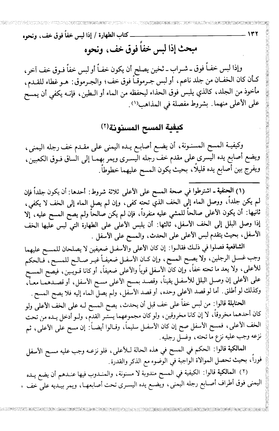 (¬2) المالكية قالوا: الكيفية في المسح مندوبة لا مسنونة، والمندوب فيها عندهم أن يضع يده اليمنى فوق أطراف أصابع رجله اليمنى، ويضع يده اليسرى تحت أصابعها، ويمر بيديه على خف