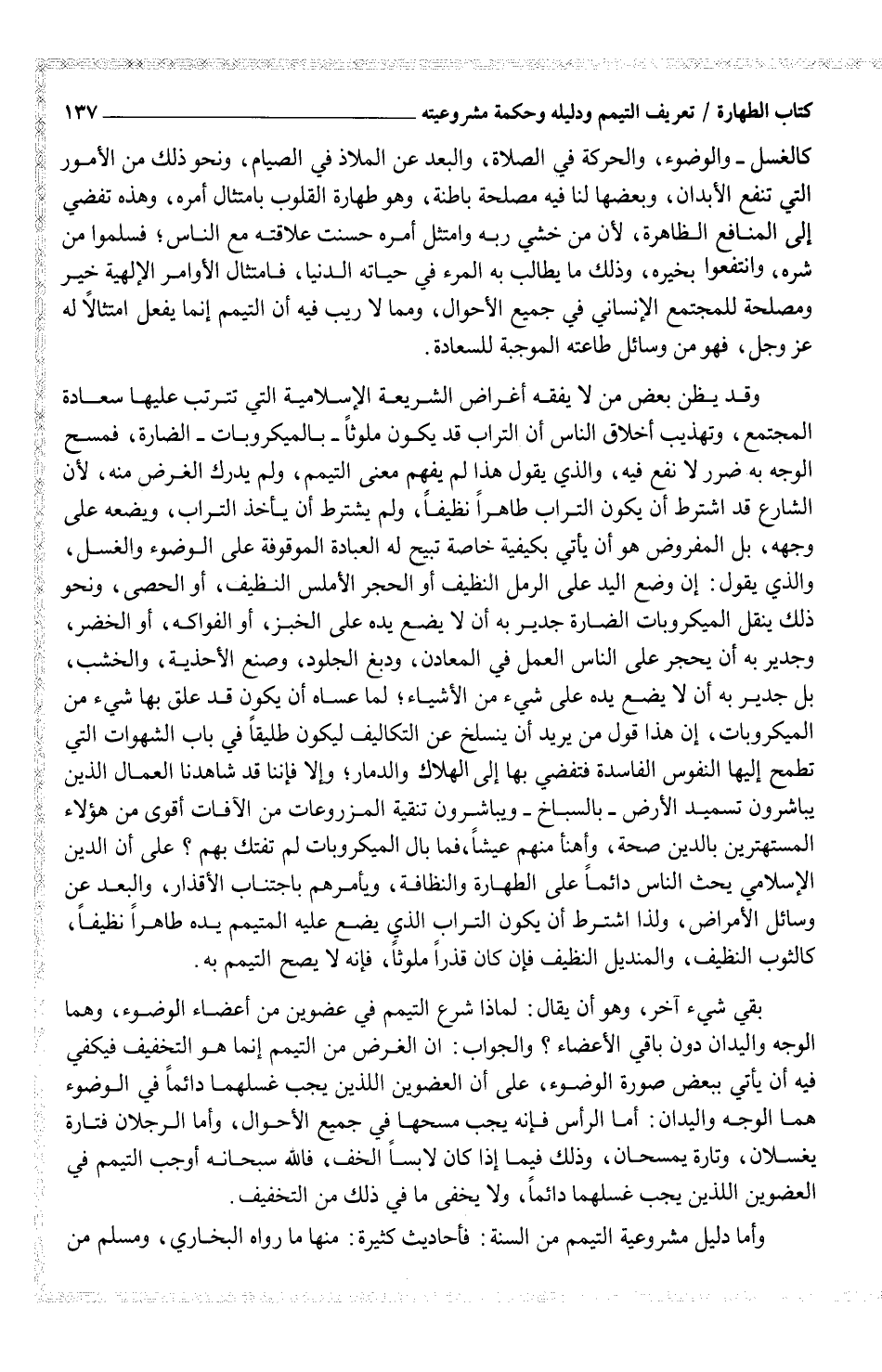 وقد يظن بعض من لا يفقه أغراض الشريعة الإسلامية التي تترتب عليها سعادة المجتمع، وتهذيب أخلاق الناس أن التراب قد يكون ملوثاً - بالميكروبات - الضارة، فمسح الوجه به ضرر لا نفع فيه، والذي يقول هذا لم يفهم معنى التيمم، ولم يدرك الغرض منه، لأن الشارع قد اشترط أن يكون التراب طاهراً نظيفاً، ولم يشترط أن يأخذ بالتراب، ويضعه على وجهه، بل المفروض هو أن يأتي بكيفية خاصة تبيح له العبادة الموقوفة على الوضوء والغسل، والذي يقول: إن وضع اليد على الرمل النظيف أو الحجر الأملس النظيف، أو الحصى، ونحو ذلك ينقل الميكروبات الضارة جدير به أن لا يضع يده على الخبز، أو الفواكه، أو الخضر، وجدير به أن يحجر على الناس العمل في المعادن، ودبغ الجلود، وصنع الأحذية، والخشب، بل جدير به أن لا يضع يده على شيء من الأشياء؛ لما عساه أن يكون قد علق بها شيء من الميكروبات، إن هذا قول من يريد أن ينسلخ عن التكاليف ليكون طليقاً في باب الشهوات التي تطمح إليها النفوس الفاسدة فتفضي بها إلى الهلاك والدمار؛ وإلا فإننا قد شاهدنا العمال الذين يباشرون تسميد الأرض - بالسباخ - ويباشرون تنقية المزروعات من الافات أقوى من هؤلاء المستهترين بالدين صحة، وأهنأ منهم عيشاً، فما بال الميكروبات لم تفتك بهم؟ على أن الدين الإسلامي يحث الناس دائماً على الطهارة والنظافة، ويأمرهم باجتناب الأقذار، والبعد عن وسائل الأمراض، ولذا اشترط أن يكون التراب الذي يضع عليه المتيمم يده طاهراً نظيفاً، كالثوب النظيف، والمنديل النظيف فإن كان قذراً ملوثاً، فإنه لا يصح التيمم به.