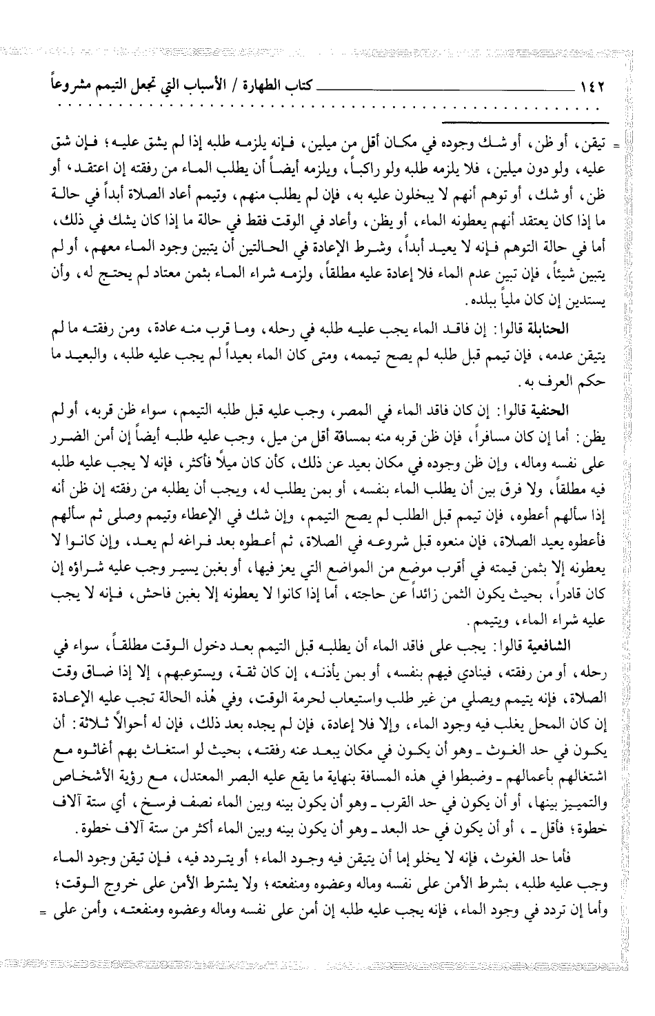 الحنابلة قالوا: إن فاقد الماء يجب عليه طلبه في رحله، وما قرب منه عادة، ومن رفقته ما لم يتيقن عدمه، فإن تيمم قبل طلبه لم يصح تيممه، ومتى كان الماء بعيداً لم يجب عليه طلبه، والبعيد ما حكم العرف به.