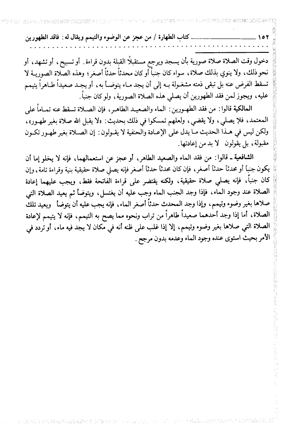 المالكية قالوا: من فقد الطهورين: الماء والصعيد الطاهر، فإن الصلاة تسقط عنه تماماً على المعتمد، فلا يصلي، ولا يقضي، ولعلهم تمسكوا في ذلك بحديث: "لا يقبل الله صلاة بغير طهور"، ولكن ليس في هذا الحديث ما يدل على الإعادة والحنفية لا يقولون: إن الصلاة بغير طهور تكون مقبولة، بل يقولون لا بد من إعادتها.