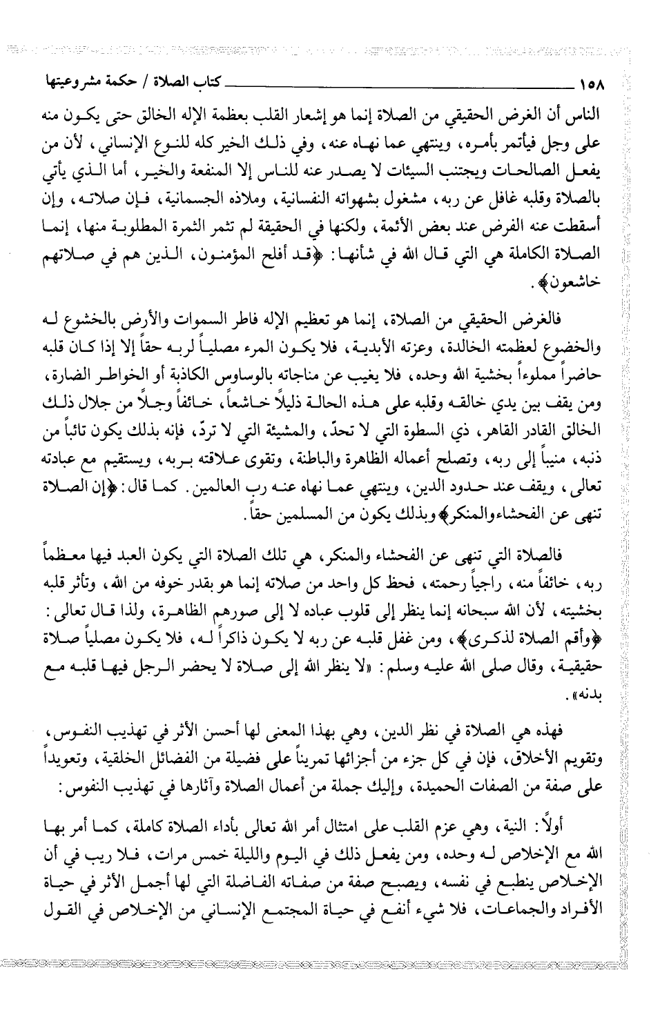 الناس أن الغرض الحقيقي من الصلاة إنما هو غشعار القلب بعظمة الإله الخالق حتى يكون منه على وجل فيأتمر بأمره، وينتهي عما نهاه عنه، وفي ذلك الخير كله للنوع الإنساني، لأن من يفعل الصالحات ويجتنب السيئات لا يصدر عنه للناس الا المنفعة والخير، أما الذين يأتي بالصلاة وقلبه غافل عن ربه، مشغول بشهواته النفسانية، وملاذه الجسمانية، فإن صلاته، وإن أسقطت عنه الفرض عند بعض الأئمة، ولكنها في الحقيقة لم تثمر الثمرة المطلوبة منها، إنما الصلاة الكاملة هي التي قال الله في شأنها: {قد أفلح المؤمنون، الذين هم في صلاتها خاشعون} .