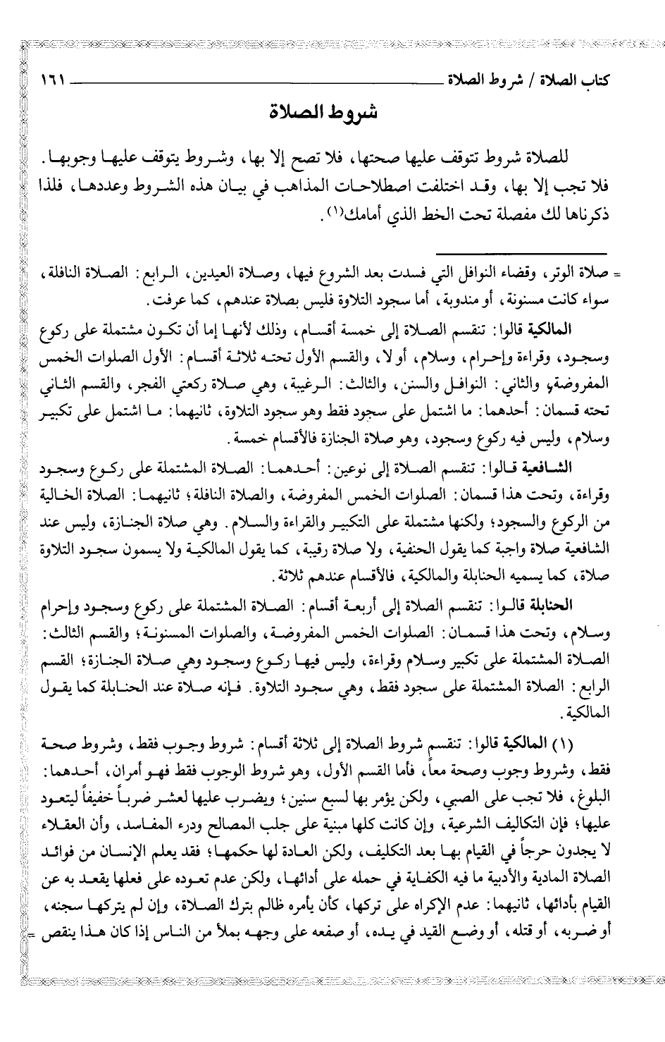 (¬1) المالكية قالوا: تنقسم شروط الصلاة إلى ثلاثة أقسام: شروط وجوب فقطن وشروط صحة فقط، وشروط وجوب وصحة معاً، فأما القسم الأول، وهو شروط الوجوب فقط فهو أمران، أحدهما: البلوغ، فلا تجب على الصبي، ولكن يؤمر بها لسبع سنين؛ ويضرب عليها لعشر ضرباً خفيفاً ليتعود عليها؛ فإن التكاليف الشرعية، وإن كانت كلها مبنية على جلب المصالح ودرء المفاسد، وأن العقلاء لا يجدون حرجاً في القيام بها بعد التكليف، ولكن العادة لها حكمها؛ فقد يعلم الإنسان من فوائد الصلاة المادية والأدبية ما فيه الكفاية في حمله على أدائها، ولكن عدم تعوده على فعلها يقعد به من القيام بأدائها، ثانيهما: عدم الإكراه على تركها، كأن يأمره ظالم بترك الصلاة، وإن لم يتركها سجنه، أو ضربه، أو قتله، أو وضع القيد في يده، أو صفعه على وجهه بملأ من الناس إذا كان هذا ينقص