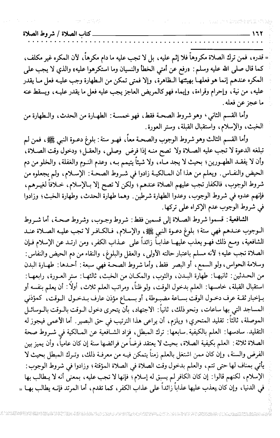 الشافعية: قسموا شروط الصلاة إلى قسمين فقط: شروط وجوب، وشروط صحة، أما شروط الوجوب عندهم فهي ستة؛ بلوغ دعوة النبي صلى الله عليه وسلم، والإسلام، فالكافر لا تجب عليه الصلاة عند للشافعية، ومع ذلك فهو يعذب عليها عذاباً زائداً على عذاب الكفر، ومن ارتد عن الإسلام فإن الصلاة تجب عليه؛ لأنه مسلم باعتبار حالته الأولى، والعقل والبلوغ، والنقاء من دم الحيض والنفاس: وسلامة الحواس، ولو السمع، أو البصر فقط، وأما شروط الصحة فهي سبعة: أحدها: طهارة البدن من الحدثين: ثانيها: طهارة البدن، والثوب، والمكان من الخبث، ثالثها: ستر العورة، رابعها: استقبال القبلة، خامسها: العلم بدخول الوقت، ولو ظناً، ومراتب العلم ثلاث، أولاً: أن يعلم بنفسه أو بغخبار ثقة عرف دخول الوقت بساعة مضبوطة، أو بسماع مؤذن عارف بدخول الوقت، كؤذني المساجد التي بها ساعات، ونحو ذلك، ثانياً: الاجتهاد، بأن يتحرى دخول الوقت بالوقت بالوسائل الموصلة، ثالثاً: تقليد المتحري؛ ويلزم، أن يراعى هذا الترتيب في حق البصير. أما الأعمى فيجوز له التقليد. سادسها: العلم بالكيفية.