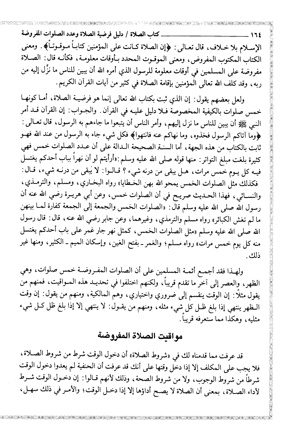 ولعل بعضهم يقول: إن الذي ثبت بكتاب الله تعالى إنما هو فرضية الصلاة، أما كونها خمس صلوات بالكيفية المخصوصة فلا دليل عليه في القرآن. والجواب: إن القرآن قد أمر النبي صلى الله عليه وسلم أن يبين للناس ما نزل إليهم، وأمر الناس أن يتبعوا ما جاءهم به الرسولن، قال تعالى: {وما آتاكم الرسول فخذوه، وما نهاكم عنه فانتهوا} فكل شيء جاء به الرسول من عند الله فهو ثابت بالكتاب من هذه الجهة، أما السنة الصحيحة الدالة على أن عدد الصلوات خمس فهي كثيرة بلغت مبلغ التواتر: منها قوله صلى الله عليه وسلم: "أرأيتم لو أن نهراً بباب أحدكم يغتسل فيه كل يوم خمس مرات، هل يبقى من درنه شيء؟ قالوا: لا يبقى من درنه شيء، قال: فكذلك مثل الصلوات الخمس يمحو الله بهن الخطايا" رواه البخاري، ومسلم، والترمذي، والنسائي، فهذا الحديث صريح في أن الصلوات خمس، وعن أبي هريرة رضي الله عنه أن رسول الله صلى الله عليه وسلم قال: "الصلوات الخمس والجمعة إلى الجمعة كفارة لما بينهن ما لم تغش الكبائر" رواه مسلم والترمذي، وغيرهما، وعن جابر رضي الله عنه، قال: قال رسول الله صلى الله عليه وسلم "مثل الصلوات الخمس، كمثل نهر جار غمر على باب أحدكم يغتسل منه كل يوم خمس مرات" رواه مسلم؛ والغمر - بفتح الغين، وإسكان الميم - الكثير، ومنها غير ذلك.