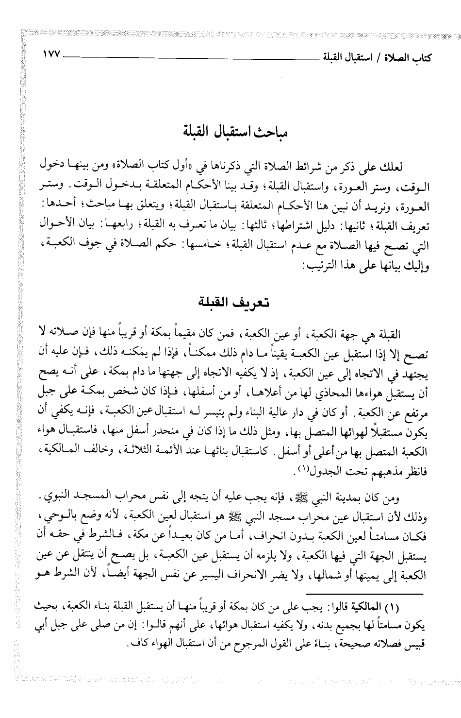 لعلك على ذكر من شرائط الصلاة التي ذكرناها في "أول كتاب الصلاة" ومن بينها دخول الوقت، وستر العورة، واستقبال القبلة؛ وقد بينا الأحكام المتعلقة بدخول الوقت. وستر العورة، ونريد أن نبين هنا الأحكام المتعلقة باستقبال القبلة؛ ويتعلق بها مباحث؛ أحدها: تعريف القبلة؛ ثانيها: دليل اشتراطها؛ ثالثها: بيان ما تعرف به القبلة؛ رابعها: بيان الأحوال التي تصح فيها الصلاة مع عدم استقبال القبلة؛ خامسها: حكم الصلاة في جوف الكعبة، وإليك بيانها على هذا الترتيب: