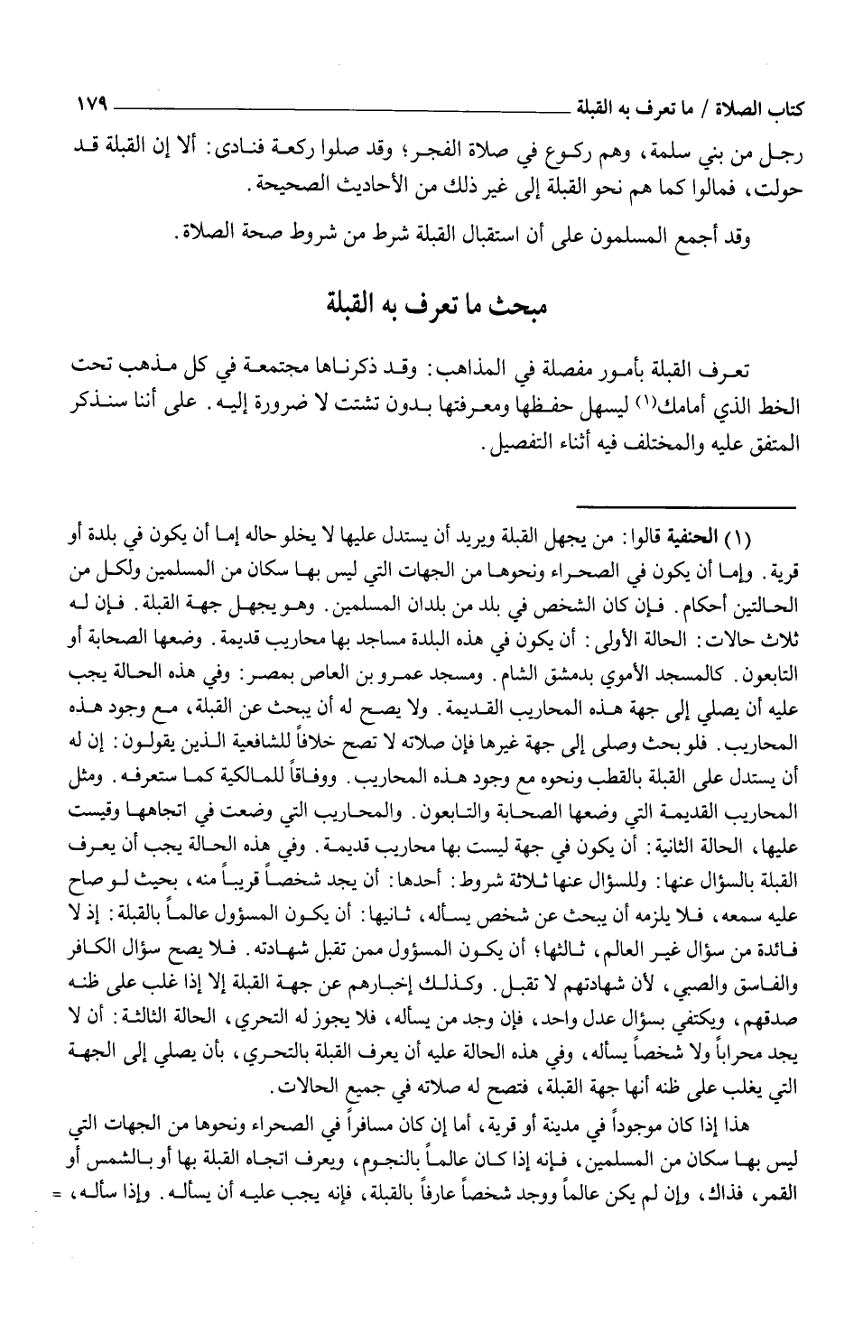 (¬1) الحنفية قالوا: من يجهل القبلة ويريد أن يستدل عليها لا يخلو حاله إما أن يكون في بلدة أو قرية. وإما أن يكون في الصحراء ونحوها من الجهات التي ليس بها سكان من المسلمين ولكل من الحالتين أحكام. فإن كان الشخص في بلد من بلدان المسلمين. وهو يجهل جهة القبلة. فإن له ثلاث حالات: الحالة الأولى: أن يكون في هذه البلدة مساجد بها محاريب قديمة. وضعها الصحابة أو التابعون. كالمسجد الأموي بدمشق الشام. ومسجد عمرو بن العاص بمصر: وفي هذه الحالة يجب عليه أن يصلي إلى جهة هذه المحاريب القديمة. ولا يصح له أن يبحث عن القبلة، مع وجود هذه المحاريب. فلو بحث وصلى إلى جهة غيرها فإن صلاته لا تصح خلافاً للشافعية الذين يقولون: إن له أن يستدل على القبلة بالقطب ونحوه مع وجود هذه المحاريب. ووفاقاً للمالكية كما ستعرفه. ومثل المحاريب القديمة التي وضعها الصحابة والتابعون. والمحاريب التي وضعت في اتجاهها وقيست عليها، الحالة الثانية: أن يكون جهة ليست بها محاريب قديمة. وفي هذه الحالة يجب أن يعرف القبلة بالسؤال عنها: وللسؤال عنها ثلاثة شروط: أحدها: أن يجد شخصاً قريباً منه، بحيث لو صاح عليه سمعه، فلا يلزمه أن يبحث عن شخص يسأله، ثانيها: أن يكون المسؤول عالماً بالقبلة: إذ لا فائدة من سؤال غير العالم، ثالثها؛ أن يكون المسؤول ممن تقبل شهادته. فلا يصح سؤال الكافر والفاسق والصبي، لأن شهادتهم لا تقبل.