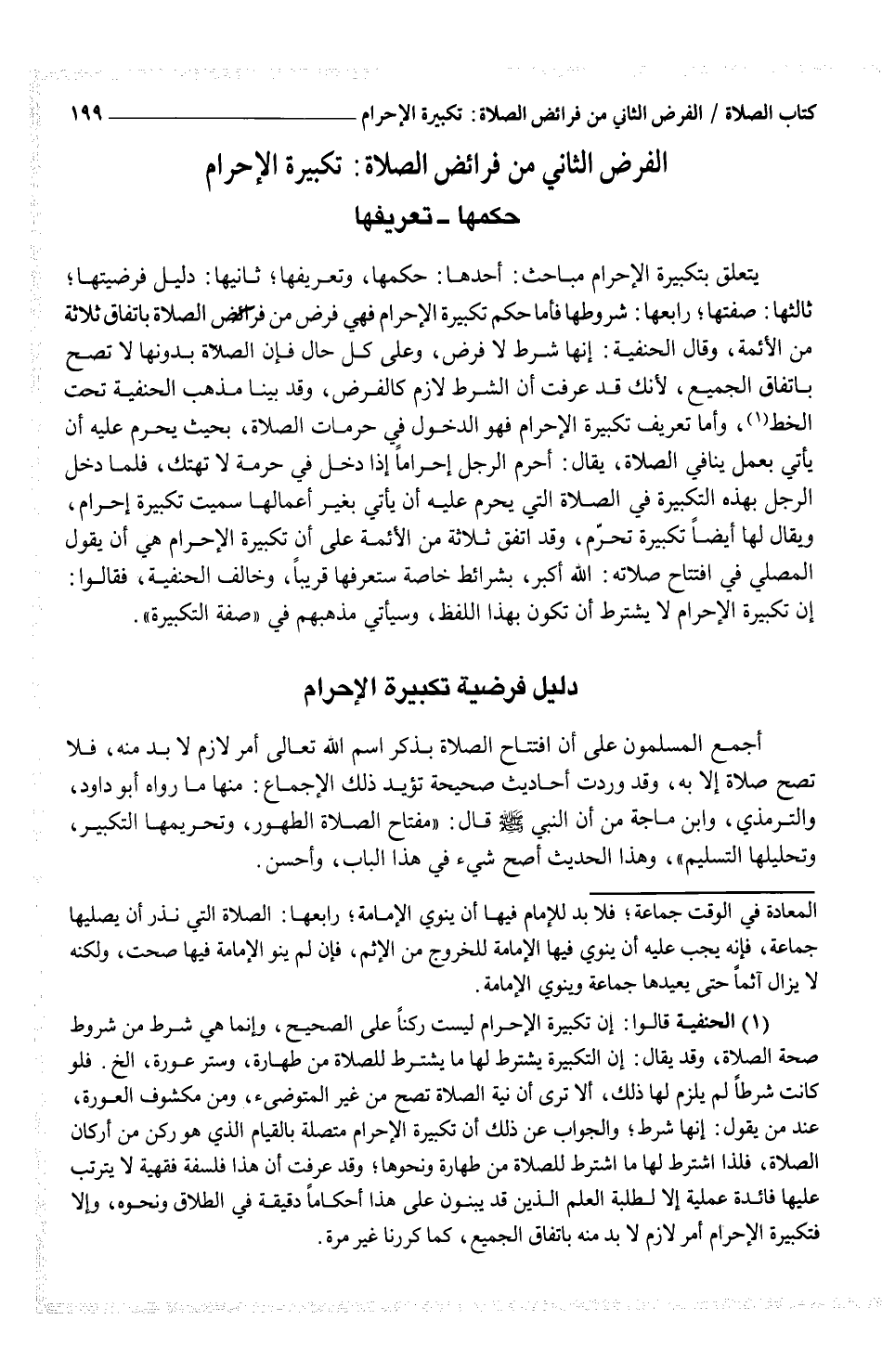 يتعلق بتكبيرة الإحرام مباحث: أحدها: حكمها، وتعريفها: ثانيها: دليل فرضيتها؛ ثالثها: صفتها؛ رابعها: شروطها فأما حكم تكبيرة الإحرام فهي فرض من فرائض الصلاة باتفاق ثلاثة من الأئمة، وقال الحنفية: إنها شرط لا فرض، وعلى كل حال فإن الصلاة بدونها لا تصح باتفاق الجميع، لأنك قد عرفت أن الشرط لازم كالفرض، وقد بينا مذهب الحنفية تحت الخط (الحنفية قالوا: إن تكبيرة الإحرام ليست ركناً على الصحيح، وإنما هي شرط من شروط صحة الصلاة، وقد يقال: إن التكبيرة يشترط لها ما يشترط للصلاة من طهارة، وستر عورة، الخ. فلو كانت شرطاً لم يلزم لها ذلك، ألا ترى أن نية الصلاة تصح من غير المتوضئ، ومن مكشوف العورة، عند من يقول: إنها شرط؛ والجواب على ذلك أن تكبيرة الإحرام متصلة بالقيام الذي هو ركن من أركان الصلاة، فلذا اشترط لها ما اشترط للصلاة من طهارة ونحوها؛ وقد عرفت أن هذا فلسفة فقهية لا يترتب عليها فائدة عملية الا لطلبة العلم الذين قد يبنون على هذا أحكاماً دقيقة في الطلاق ونحوه، وإلا فتكبيرة الإحرام أمر لازم لا بد منه باتفاق الجميع، كما كررنا غير مرة) ، وأما تعريف تكبيرة الإحرام فهو الدخول في حرمات الصلاة، بحيث يحرم عليه أن يأتي بعمل ينافي الصلاة، يقال: أحرم الرجل إحراماً إذا دخل في حرمة لا تهتك، فلما دخل الرجل بهذه التكبيرة في الصلاة التي يحرم عليه أن يأتي بغير أعمالها سميت تكبيرة إحرام، ويقالها أيضاً تكبيرة تحرّم، وقد اتفق ثلاثة من الأئمة على أن تكبيرة الإحرام هي أن يقول المصلي في افتتاح صلاته: الله أكبر، بشرائط خاصة ستعرفها قريباً، وخالف الحنفية، فقالوا: إن تكبيرة الإحرام لا يشترط أن تكون بهذا اللفظ، وسيأتي مذهبهم في "صفة التكبيرة".