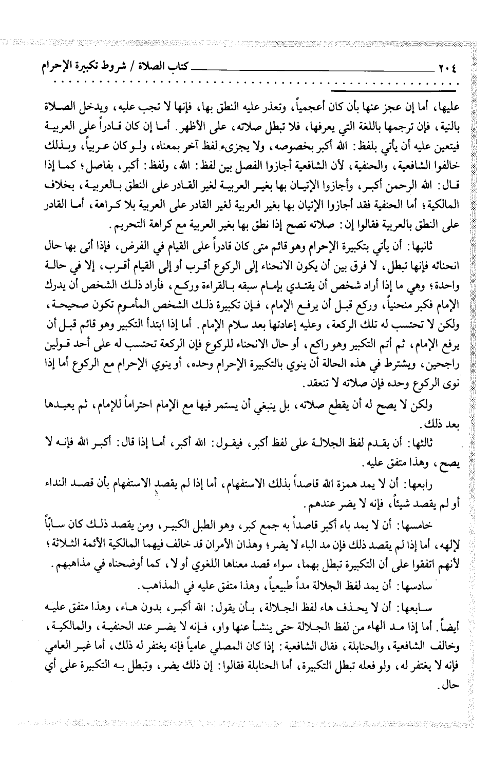 سابعها: أن لا يحذف هاء لفظ الجلالة، بأن يقول: الله أكبر، بدون هاء، وهذا متفق عليه أيضاً. أما إذا مد الهاء من لفظ الجلالة حتى ينشأ عنها واو، فإنه لا يضر عند الحنفية، والمالكية، وخالف الشافعية، والحنابلة، فقال الشافعية: إذا كان المصلي عامياً فإنه يغتفر له ذلك، أما غير العامي فإنه لا يغتفر له، ولو فعله تبطل التكبيرة، أما الحنابلة قالوا: إن ذلك يضر، وتبطل به التكبيرة على أي حال.