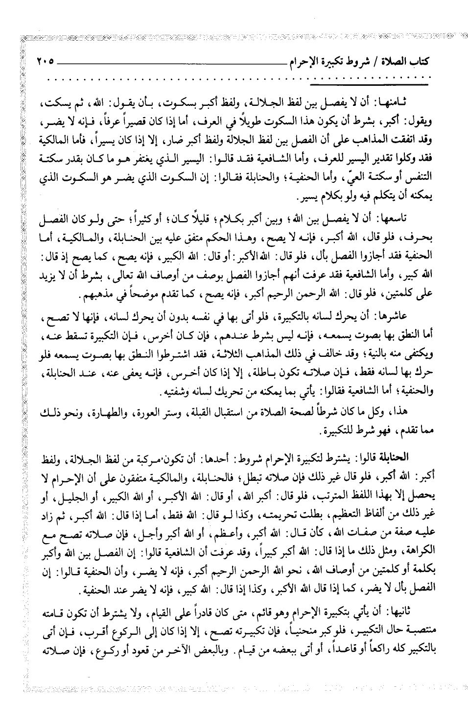 تاسعها: أن لا يفصل بين الله؛ وبين أكبر بكلام؛ قليلاً كان؛ أو كثيراً؛ حتى ولو كان الفصل بحرف، فلو قال، الله أكبر، فإنه لا يصح، وهذا الحكم متفق عليه بين الحنابلة، والمالكية، أما الحنفية فقد أجازوا الفصل بأل، فلو قال: الله الأكبر: أو قال: الله الكبير، فإنه يصح، كما يصح إذ قال: الله كبير، وأما الشافعية فقد عرفت أنهم أجازوا الفصل بوصف من أوصاف الله تعالى، بشرط أن لا يزيد على كلمتين، فلو قال: الله الرحمن الرحيم أكبر، فإنه يصح، كما تقدم موضحاً في مذهبهم.