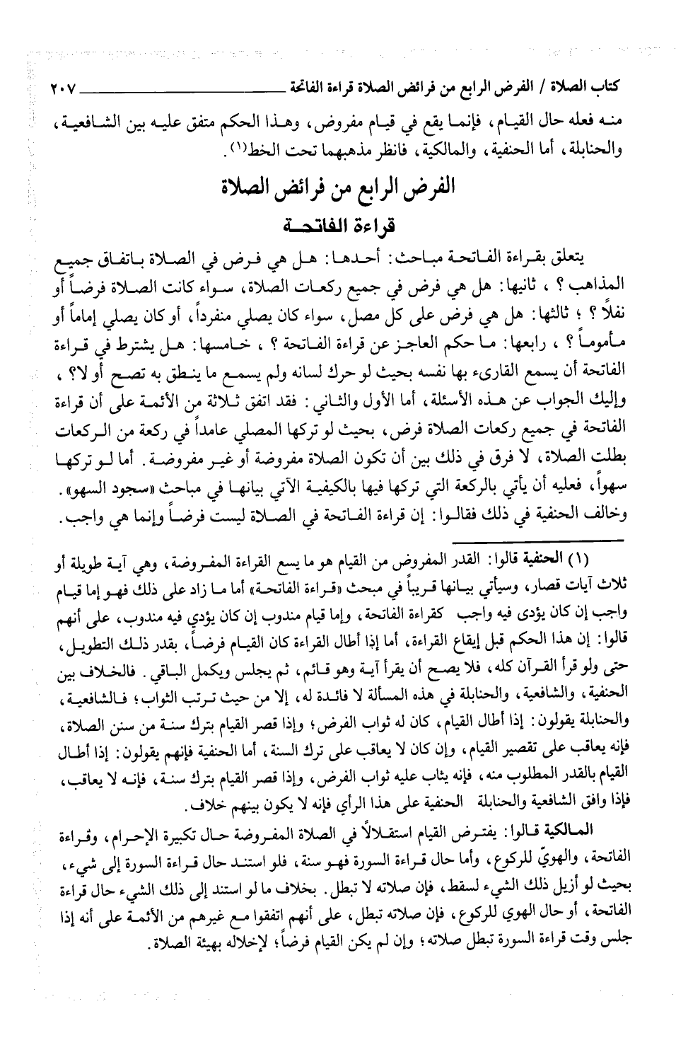 (¬1) الحنفية قالوا: القدر المفروض من القيام هو ما يسع القراءة المفروضة، وهي آية طويلة أو ثلاث آيات قصار، وسيأتي بيانها قريباً في مبحث "قراءة الفاتحة" أما ما زاد على ذلك فهو إما قيام واجب إن كان يؤدي فيه واجب كقراءة الفاتحة، وإما قيام مندوب إن كان يؤدي فيه مندوب، على أنهم قالوا: إن هذا الحكم قبل إيقاع القراءة، أما إذا أطال القراءة كان القيام فرضاً، بقدر ذلك التطويل، حتى ولو قرأ القرآن كله، فلا يصح أن يقرأ آية وهو قائم، ثم يجلس ويكمل الباقي. فالخلاف بين الحنفية، والشافعية، والحنابلة في هذه المسألة لا فائدة له، الا من حيث ترتب الثواب؛ فالشافعية، والحنابلة يقولون: إذا أطال القيام، كان له ثواب الفرض؛ وإذا قصر القيام بترك سنة من سنن الصلاة، فإنه يعاقب على تقصير القيام، وإن كان لا يعاقب على ترك السنة، أما الحنفية فإنهم يقولون: إذا أطال القيام بالقدر المطلوب منه، فإنه يثاب عليه ثواب الفرض، وإذا قصر القيام بترك سنة، فإنه لا يعاقب، فإذا وافق الشافعية والحنابلة والحنفية على هذا الرأي فإنه لا يكون بينهم خلاف.