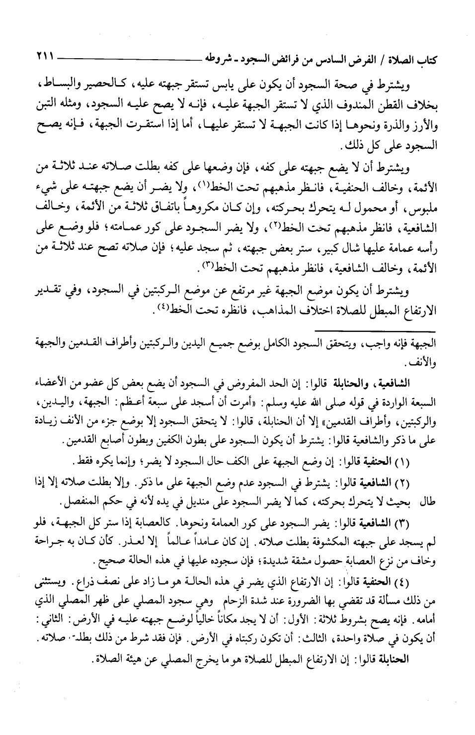 ويشترط أن يكون موضع الجبهة غير مرتفع عن موضع الركبتين في السجود، وفي تقدير الارتفاع المبطل للصلاة اختلاف المذاهب، فانظره تحت الخط (¬4) .
