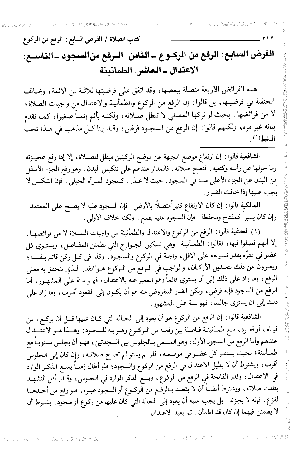 (¬1) الحنفية قالوا: الرفع من الركوع والاعتدال والطمأنينة من واجبات الصلاة لا من فرائضها الا أنهم فصلوا فيها، فقالوا: الطمأنينة وهي تسكين الجوارح التي تطمئن المفاصل، ويستوي كل عضو في مقرّه بقدر تسبيحة على الأقل، واجبة في الركوع والسجود، وكذا في كل ركن قائم بنفسه؛ ويعبرون عن ذلك بتعديل الأركان، والواجب في الرفع من الركوع هو القدر الذي يتحقق به معنى الرفع، وما زاد على ذلك إلى أن يستوي قائماً وهو المعبر عنه بالاعتدال، فهو سنة على المشهور، أما الرفع من السجود فإنه فرض، ولكن القدر المفروض منه هو أن يكون إلى القعود أقرب، وما زاد على ذلك إلى أن يستوي جالسا، فهو سنة على المشهور.