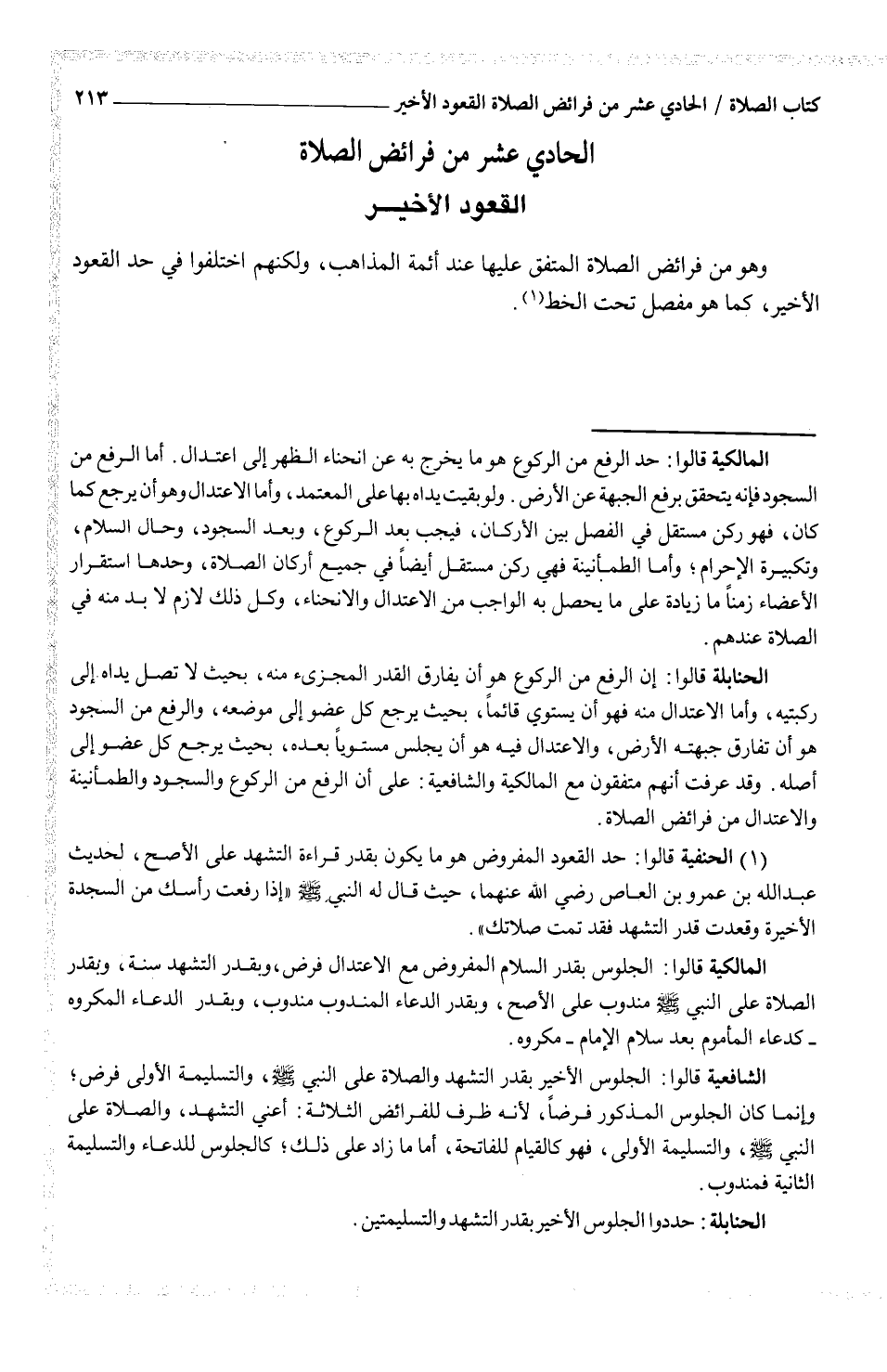 (¬1) الحنفية قالوا: حد القعود المفروض هو ما يكون بقدر قراءة التشهد على الأصح، لحديث عبد الله بن عمرو بن العاص رضي الله عنهما، حيث قال له النبي صلى الله عليه وسلم "إذا رفعت رأسك من السجدة الأخيرة وقعدت قدر التشهد فقد تمت صلاتك".
