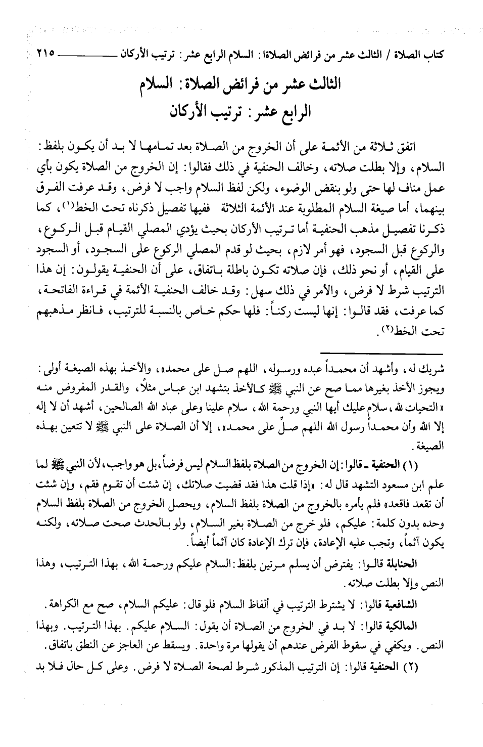 اتفق ثلاثة من الأئمة على أن الخروج من الصلاة بعد تمامها لا بد أن يكون بلفظ: السلام، وإلا بطلت صلاته، وخالف الحنفية في ذلك فقالوا: إن الخروج من الصلاة يكون بأي عمل مناف لها حتى ولو بنقض الوضوء، ولكن لفظ السلام واجب لا فرض، وقد عرفت الفرق بينهما، أما صيغة السلام المطلوبة عند الأئمة الثلاثة ففيها تفصيل ذكرناه تحت الخط (¬1) ، كما ذكرنا تفصيل مذهب الحنفية أما ترتيب الأركان بحيث يؤدي المصلي القيام قبل الركوع، والركوع قبل السجود، فهو أمر لازم، بحيث لو قدم المصلي الركوع على السجود، أو السجود على القيام، أو نحو ذلك، فإن صلاته تكون باطلة باتفاق، على أن الحنفية يقولون: إن هذا الترتيب شرط لا فرض، والأمر في ذلك سهل: وقد خال الحنفية الأئمة في قراءة الفاتحة، كما عرفت، فقد قالوا: إنها ليست ركناً: فلها حكم خاص بالنسبة للترتيب، فانظر مذهبهم تحت الخط (¬2) .
