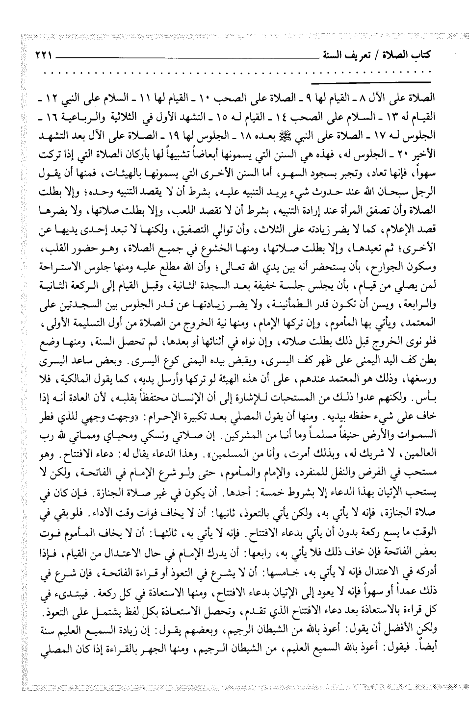 الصلاة على الآل 8 - القيام لها 9 - الصلاة على الصحب 10 - القيام لها 11 - السلام على النبي 12 - القيام له 13 - السلام على الصحب 14 - القيام له 15 - التشهد الأول في الثلاثية والرباعية 16 - الجلوس له 17 - الصلاة على النبيي صلى الله عليه وسلم بعده 18 - الجلوس لها 19 - الصلاة على الآل بعد التشهد الأخير 20 - الجلوس له، فهذه هي السنن التي يسمونها أبعاضاً تشبيهاً لها بأركان الصلاة التي إذا تركت سهواً، فإنها تعاد، وتجبر بسجود السهو، أما السنن الأخرى التي يسمونها بالهيئات فمنها أن يقول الرجل سبحان الله عند حدوث شيء يريد التنبيه عليه، بشرط أن لا يقصد التنبيه وحده؛ وإلا بطلت الصلاة وأن تصفق المرأة عند إرادة التنبيه، بشرط أن لا تقصد اللعب، وإلا بطلت صلاتها، ولا يضرها قصد الإعلام، كما لا يضر زيادته على الثلاث، وأن توالي التصفيق، ولكنها لا تبعد إحدى يديها عن الأخرى؛ ثم تعيدها، وإلا بطلت صلاتها، ومنها الخشوع في جميع الصلاة، وهو حضور القلب، وسكون الجوارح، بأن يستحضر أنه بين يدي الله تعالى؛ وأن الله مطلع عليه ومنها جلوس الاستراحة لمن يصلي من قيام، بأن يجلس جلسة خفيفة بعد السجدة الثانية، وقبل القيام إلى الركعة الثانية والرابعة، ويسن أن تكون قدر الطمأنينة، ولا يضر زيادتها عن قدر الجلوس بين السجدتين على المعتمد، ويأتي بها المأموم، وإن تركها الإمام، ومنها نية الخروج من الصلاة من أول التسليمة الأولى،
