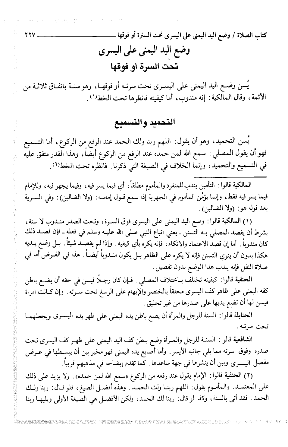 (¬1) المالكية قالوا: وضع اليد اليمنى على اليسرى فوق السرة، وتحت الصدر مندوب لا سنة، بشرط أن يقصد المصلي به التسنن - يعني اتباع النبي صلى الله عليه وسلم في فعله - فإن قصد ذلك كان مندوباً. أما إن قصد الاعتماد والاتكاء، فإنه يكره بأي كيفية. وإذا لم يقصد شيئاً. بل وضع يديه هكذا بدون أن ينوي التسنن فإنه لا يكره على الظاهر بل يكون مندوباً أيضاً. هذا في الفرض أما في صلاة النفل فإنه يندب هذ الوضع بدون تفصيل.