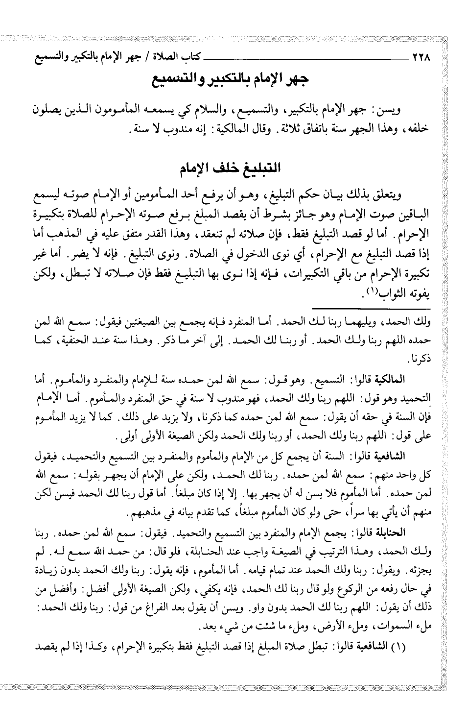 ويتعلق بذلك بيان حكم التبليغ، وهو أن يرفع أحد المأمومين أو الإمام صوته ليسمع الباقين صوت الإمام وهو جائز بشرط أن يقصد المبلغ برفع صوته الإحرام للصلاة بتكبيرة الإحرام. أما لو قصد التبليغ فقط، فإن صلاته لم تنعقد، وهذا القدر متفق عليه في المذهب أما إذا قصد التبليغ مع الإحرام، أي نوى الدخول في الصلاة. ونوى التبليغ. فإنه لا يضر. أما غير تكبيرة الإحرام من باقي التكبيرات، فإنه إذا نوى بها التبليغ فقد فإن صلاته لا تبطل، ولكن يفوته الثواب (¬1) .