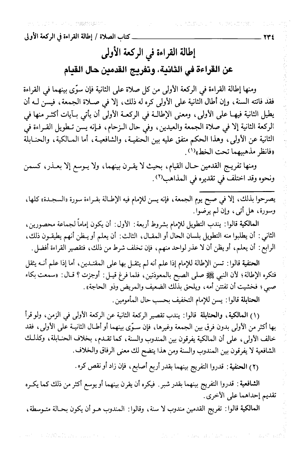 (¬1) المالكية، والحنابلة قالوا: يندب تقصير الركعة الثانية عن الركعة الأولى في الزمن، ولو قرأ بها أكثر من الأولى بدون فرق بين الجمعة وغيرها، فإن سوّى بينهما أو أطال الثانية على الأولى، فقد خالف الأولى، على أن المالكية يفرقون بين المدوب والسنة، كما تقدم، بخلاف الحنابلة، وكذلك الشافعية لا يفرقون بين المندوب والسنة ومن هذا يتضح لك معنى الرفاق والخلاف